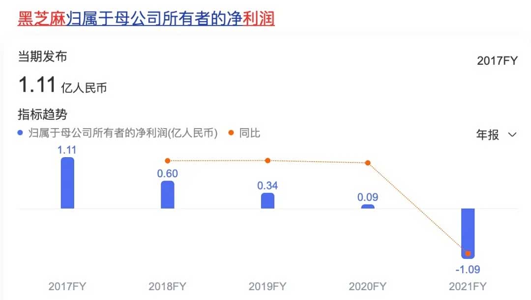 此后,黑芝麻的业绩开始走下坡路,连续四年盈利下滑,2021年亏损1.09亿元。