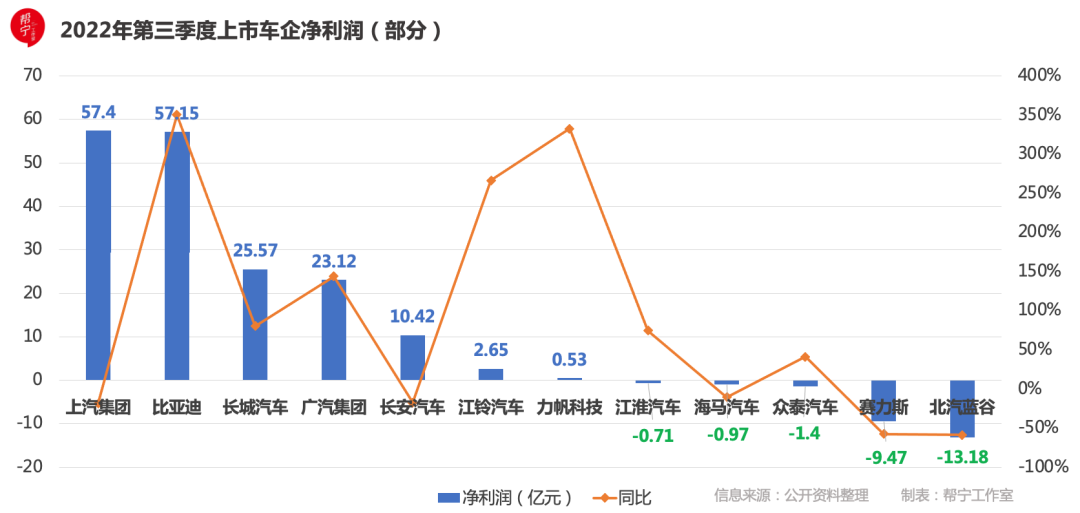 从净利润来看,有7家车企在第三季度盈利,此中,比亚迪、江铃汽车、力帆科技的净利润同比增近3倍。受疫情、缺芯、原材料价格上涨等冲击,长安汽车、上汽集团、江淮汽车、众泰汽车、北汽蓝谷等车企盈利同比有所下滑。