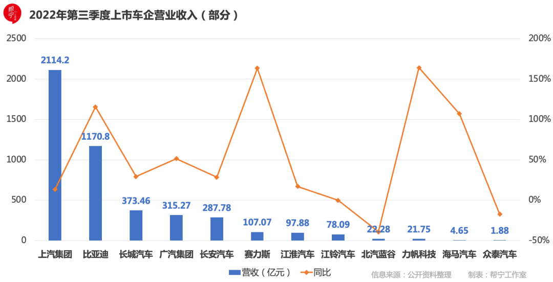 帮宁工作室统计了12家车企的数据,从营业收入来看,有9家车企第三季度实现营业收入正增长,另3家负增长。其中,力帆科技、赛力斯、比亚迪和海马汽车营业收入同比增超一倍。