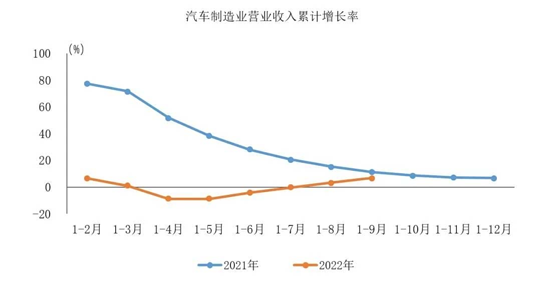 复苏信号传递到整个汽车大盘。中国汽车工业协会整理的国家统计局数据显示,2022年1~9月,汽车制造业完成营业收入6.61万亿元,同比增长6.7%,占规模以上工业企业营业收入总额的比重为6.6%。