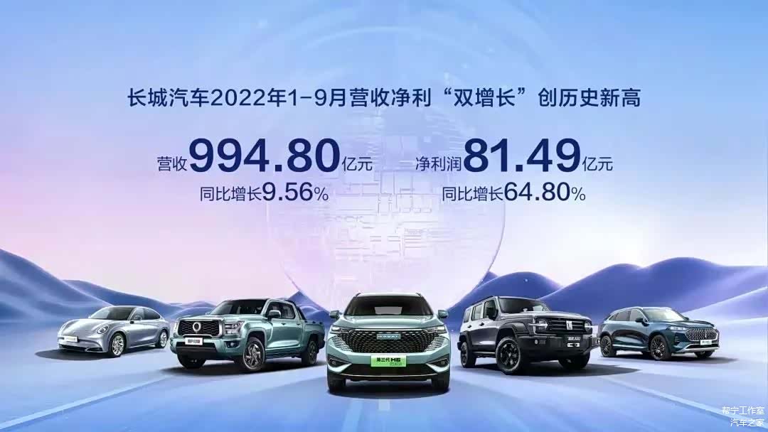 今年第三季度,长城汽车营业总收入373.5亿元,同比增长29.4%;归属于上市公司股东的净利润约25.6亿元,同比增长80.7%。前三季度,其营收达994.8亿元,同比增长9.6%,净利润同比增长64.8%至81.5亿元。