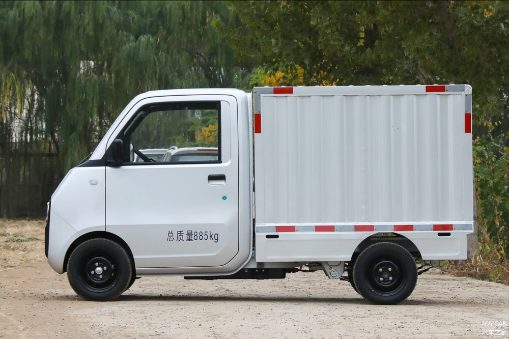 侧面看起来更像是微型的货车,新车的整体重量为885kg,具体的装货容量大概为1.68立方米,其最大的载货量为215kg,整体的长宽高为3310mm,1080mm,1690mm,载货量还是非常可观的。