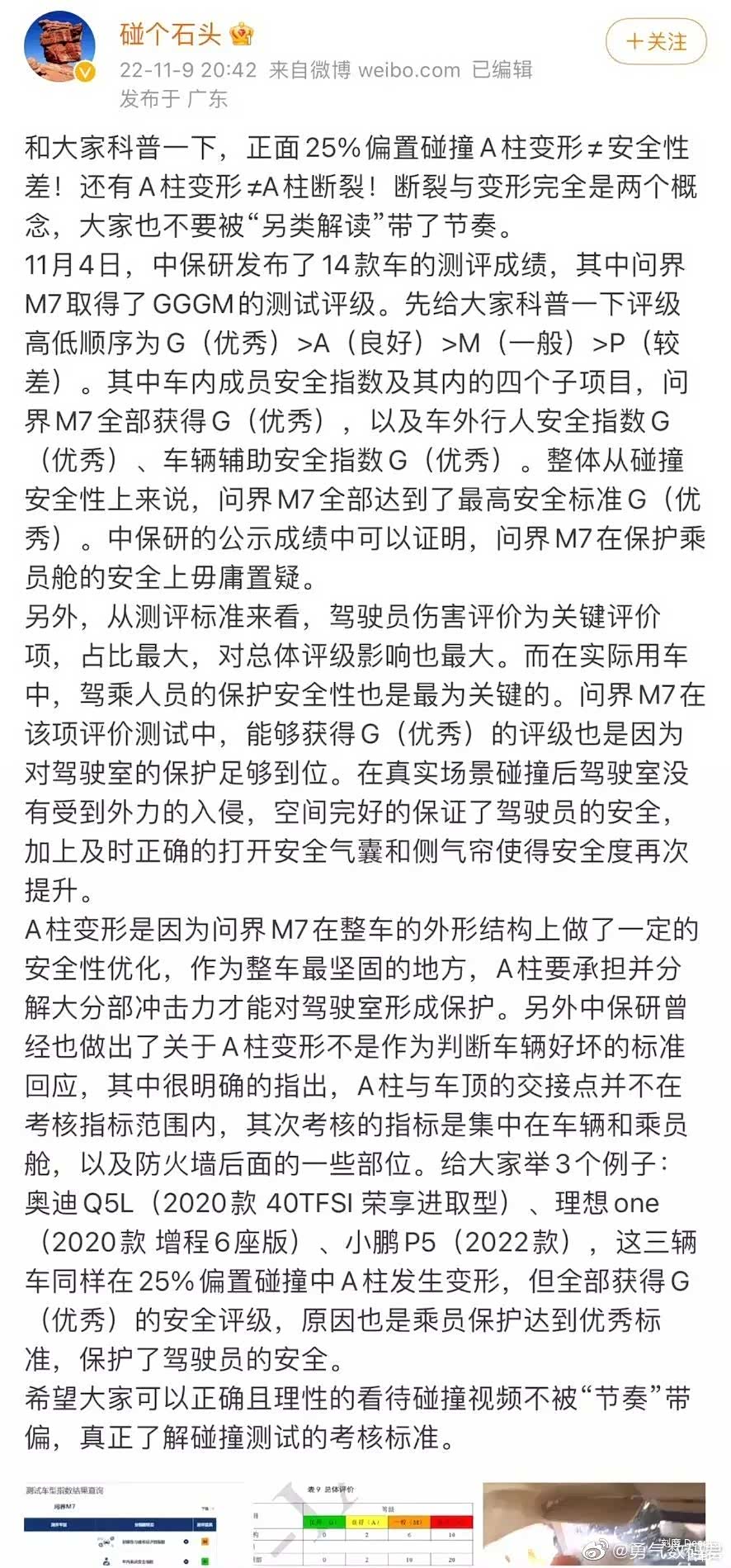 针对此次问界M7的碰撞测试,目前也已有认证为“华为智能汽车解决方案工程师”博主在网络上回应了。