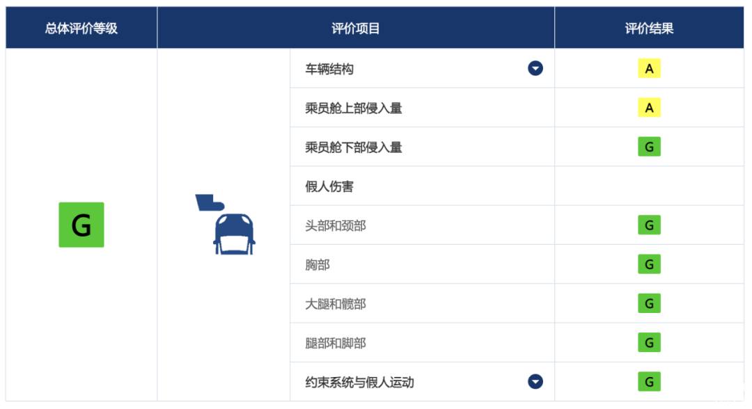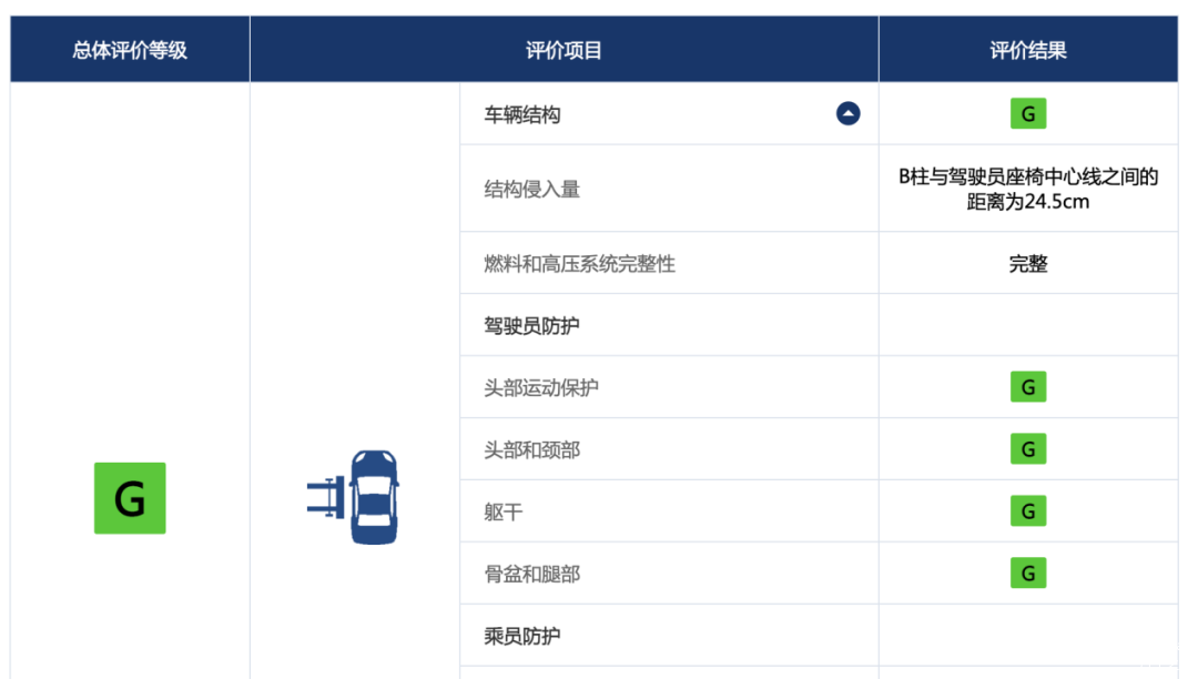 乘员安全一项评价中包含25%偏置碰撞、测碰、车顶强度等几项单独测试内容。