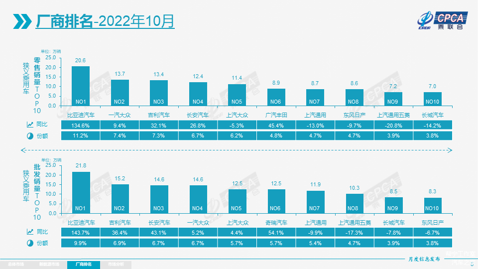 中国汽车品牌集体向上。10月,其国内零售份额为51.5%,同比增长6个百分点。1~10月,其累计份额达到52%,同比大幅增长11.4个百分点。