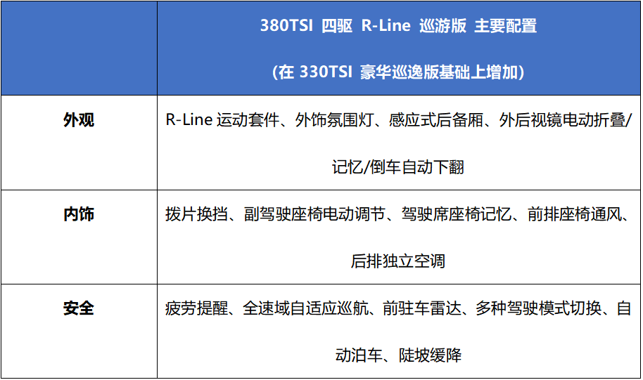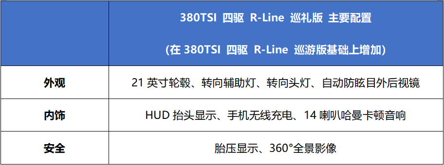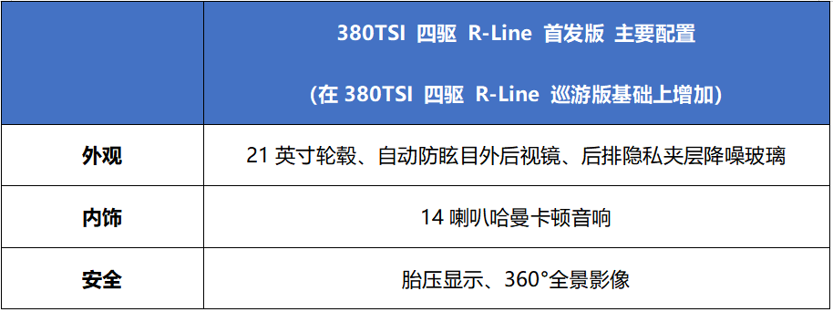 380TSI四驱R-Line首发版在售价上与380TSI 四驱R-Line巡游版一致,但配置部分则增加了21英寸轮辋、后排隐私+降噪玻璃、自动防眩目外后视镜、360°全景影像、胎压显示、哈曼卡顿音响等配置,可谓是加量不加价,性价比比R-Line巡游版更高,因此该版本最值得推荐。
