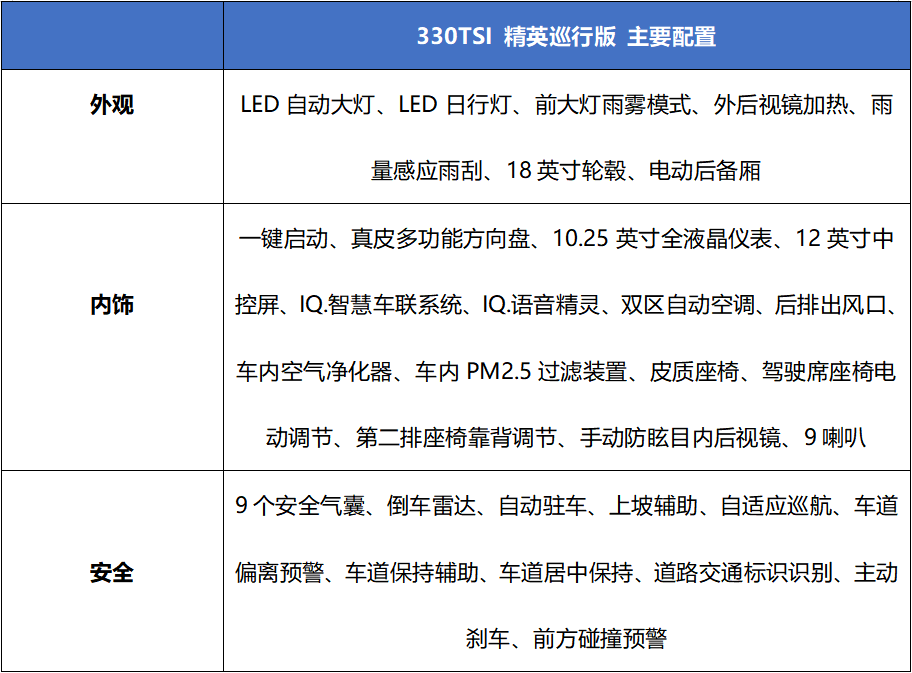 该版本为入门版车型,搭载2.0T低功率动力,配置方面LED大灯、自动头灯、IQ.智慧车联系统、IQ.语音精灵、双区自动空调、ACC自适应巡航以及IQ.Drive驾驶辅助系统等等均为标配,整体有着不错的实用性和科技性。对于预算不多,但又想拥有大空间的消费者来说,该版本就很值得购买。