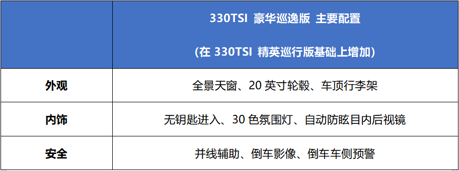 该版本为顶配车型,和R-Line巡游版相比,配置上增加了21英寸轮毂、转向辅助灯/头灯、HUD抬头显示、手机无线充电、14喇叭哈曼卡顿音响、360°全景影像等配置,在科技感和豪华感方面有了进一步的提升,但是考虑到就此要多花2万元,并不是那么的物有所值,性价比不高,除非你不差钱,否则不推荐上顶配。
