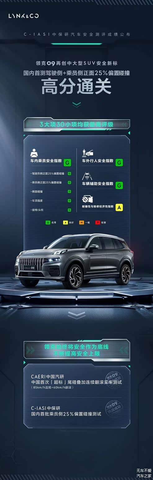 相信现在买车的消费者,应该没有人会不在意安全碰撞成绩的吧?毕竟这可关乎到每一位的“身家性命”。这不,中保研不久前刚刚公布了一批碰撞测试成绩,此次碰撞更是首次引入25%右侧小偏置碰撞测试,参与测试的包括奥迪A7L、理想L9、问界M7等在内的14辆车型,其中领克09车型综合表现成绩最好。