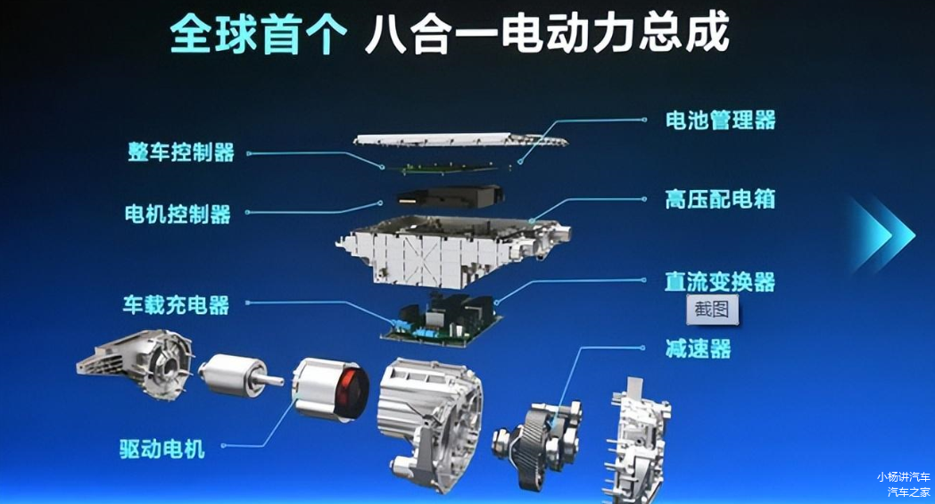 比亚迪研发的八合一高效电驱总成,集成了驱动电机、减速器、驱动电机控制器、高低压直流转换器(DCDC)、双向车载充电器(OBC)、高压配电箱(PDU)、电池管理器(BMS)、整车控制器(VCU)八大模块,其整体性能较上一代功率密度提升20%,整机重量和体积分别降低15%、20%,系统综合效率达到89%,其最大功率270kw,具备前驱、后驱、双电机四驱三种驱动形式,满足A0级到C/D级车型动力搭载需求。