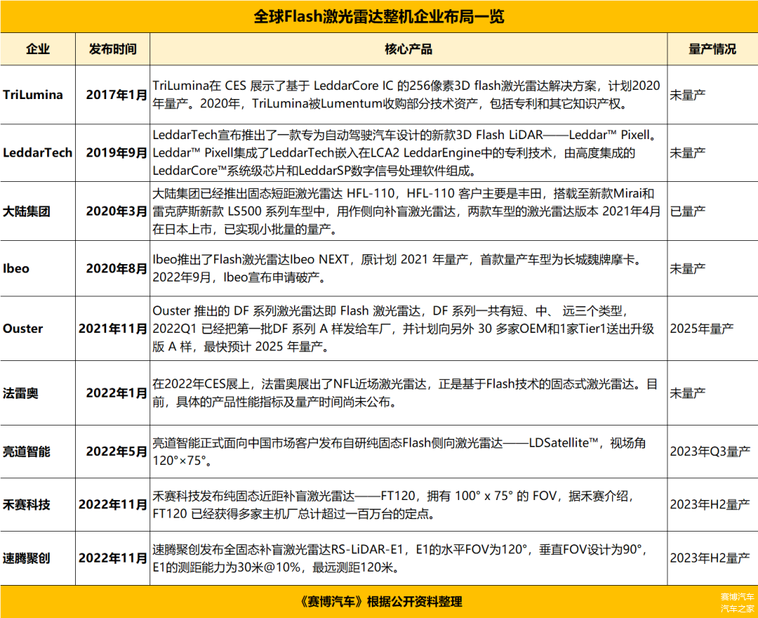 进入2022年,国内几家头部激光雷达公司亮道智能、禾赛科技、速腾聚创先后发布Flash激光雷达,且普遍将2023年下半年作为量产关键时间节点,这让Flash激光雷达再次成为业内关注的焦点。