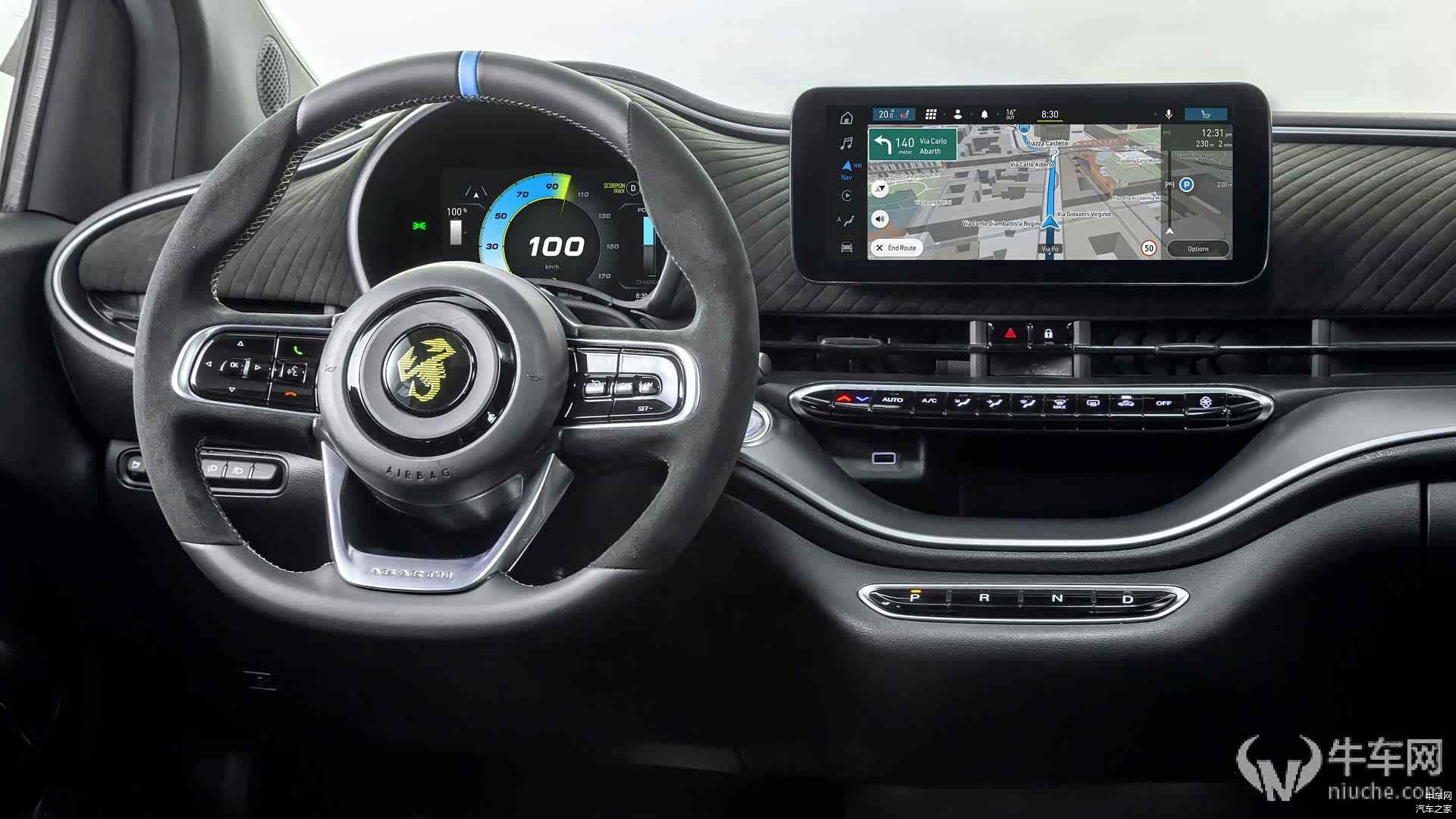 内饰方面相比于燃油版的菲亚特500和阿巴斯595等车型,变得更加精致了,三幅式运动方向盘看上去手感很棒,但目测体积并没有变小,我们曾在体验阿巴斯595的时候对这个与车身尺寸大小不匹配的方向盘稍有不满。不过各种Alcantara的材料、JBL音响、无线充电、自动大灯这种配置都被加入了,整体还是有很大进步的。