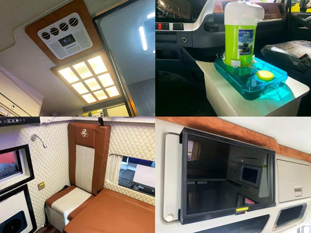 卧室,双卧铺设计,上铺单人床,下铺双人床,宽度达1.4米,还有夜灯、插座、衣柜、遮阳帘;客厅,驻车空调、车载饮水机、灵活应用的沙发椅,顶部储物柜处配备了无线网络小型电视机;