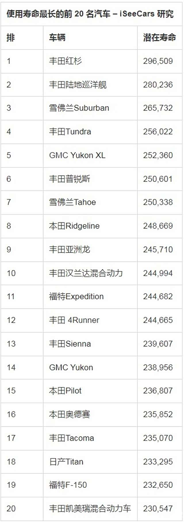 丰田在榜单上占据主导地位,前 20 名车型中有 10 款能够达到 230,000 英里以上