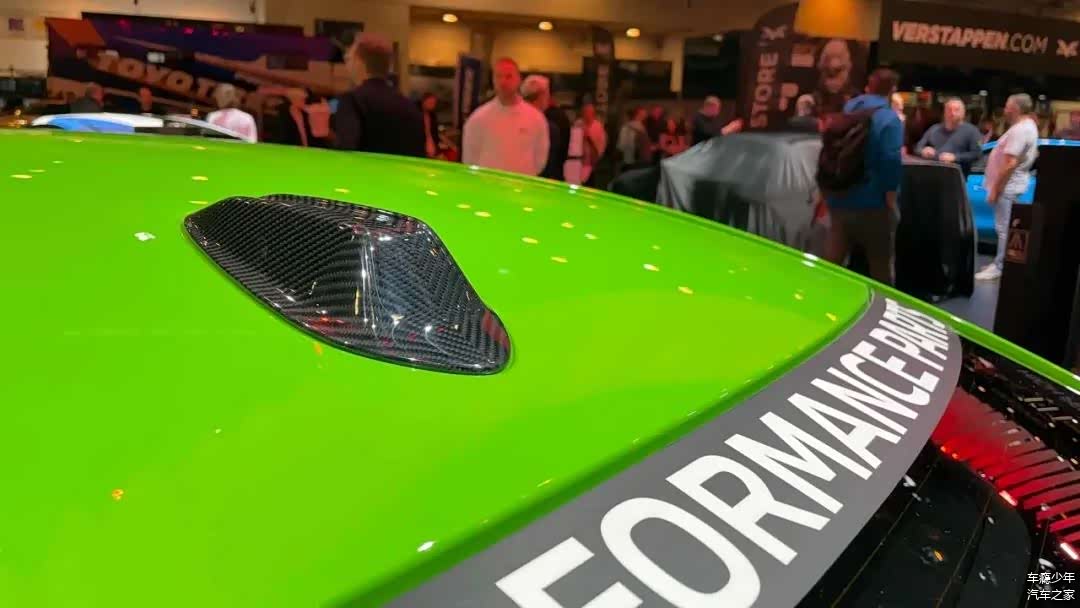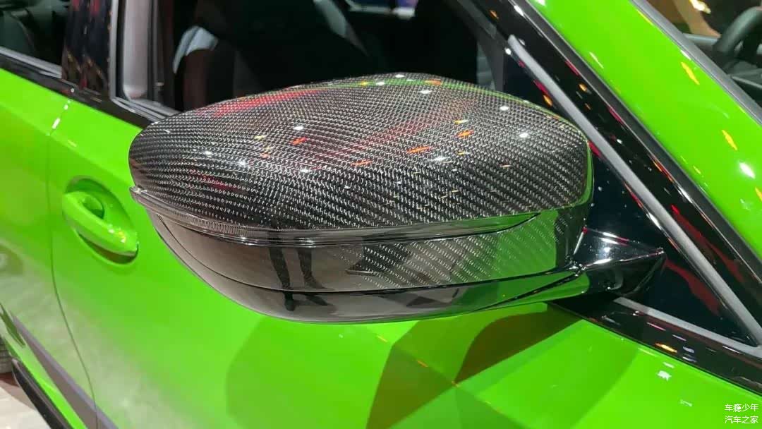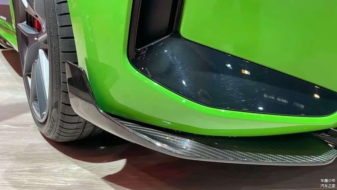 前中网、前唇、后视镜以及车顶天线等处都换上了碳纤维材质的饰板,同时前大灯也经过了熏黑处理。