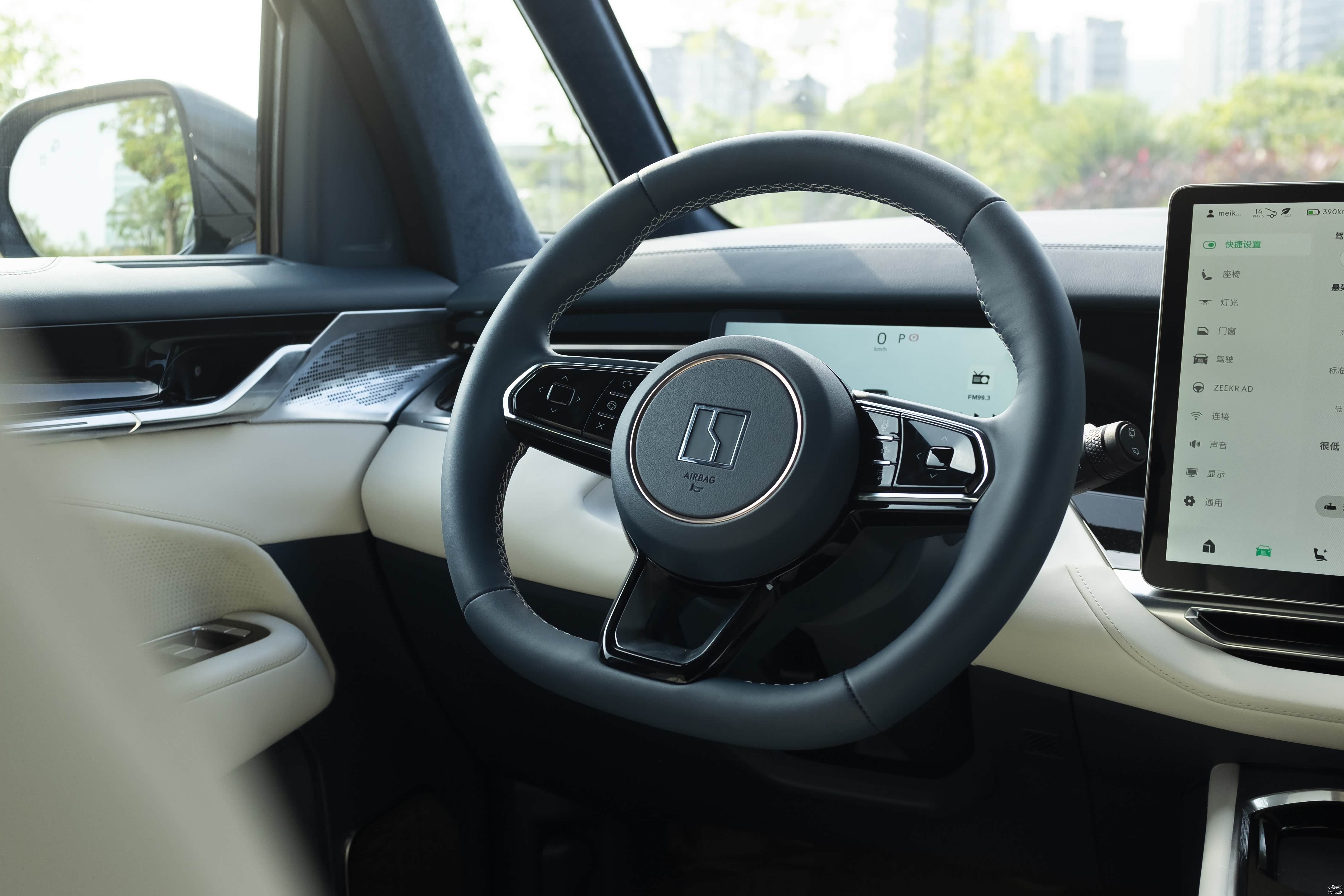 内容显示更为清晰10.25英寸仪表屏,真皮的三幅式方向盘,与001的触控板不同,009换成了物理按键,这点在驾驶中的盲操作挺好的。