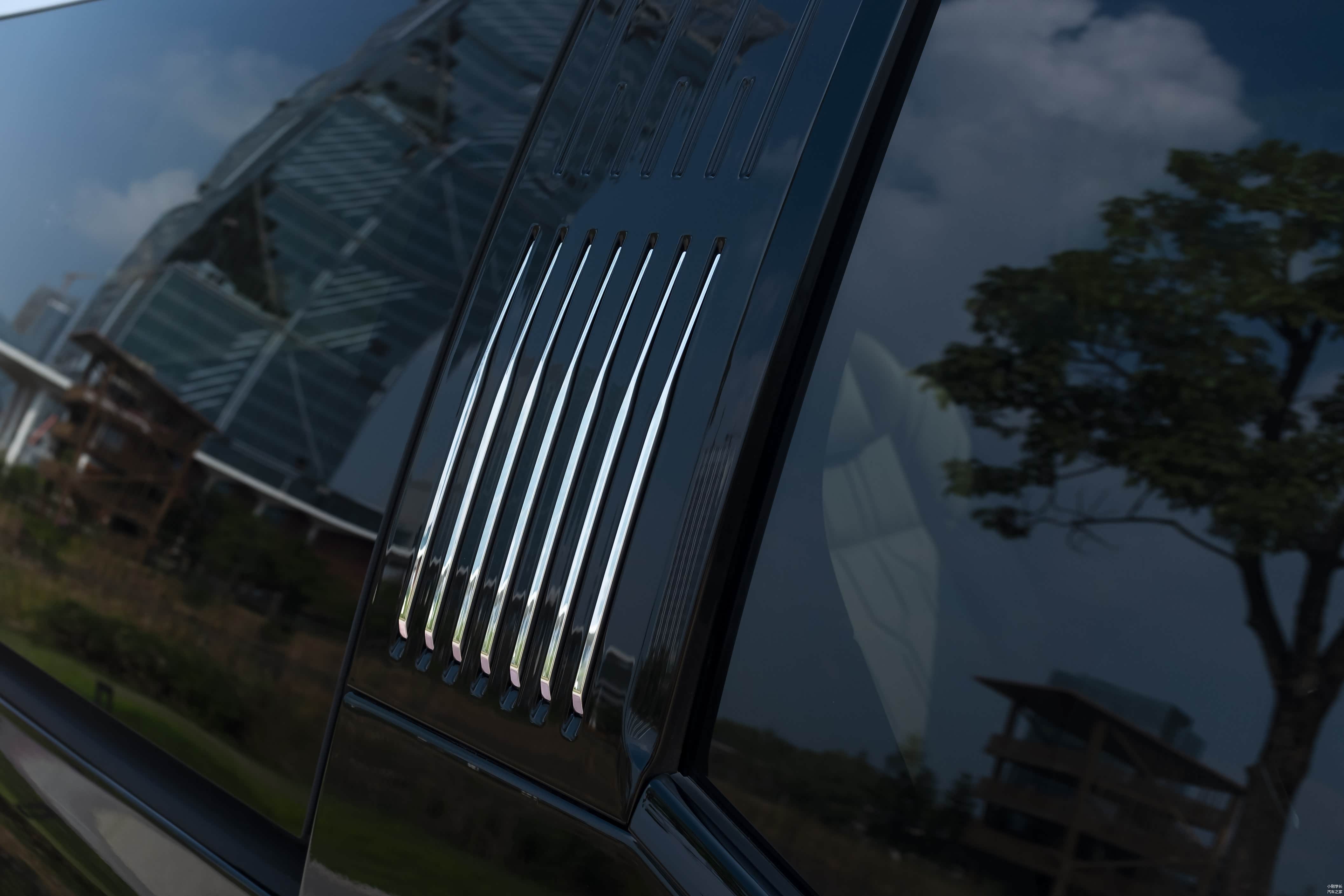 极氪009的长宽高尺寸分别为 5209mm/2024mm/1856mm,轴距为3205mm,在同级别车型来说有优势,空气悬挂高度调节范围11mm,降到最低时候车身还挺好看,另外降到最低时车辆离地间隙122mm,第二排台阶到地面高度最低仅有36cm。侧面我喜欢的几个点,首先这个透明双A柱设计,作用更多是给驾驶者减小盲区视野,采用了悬浮式车顶配色,C柱用了一点高亮镀铬饰条点缀。