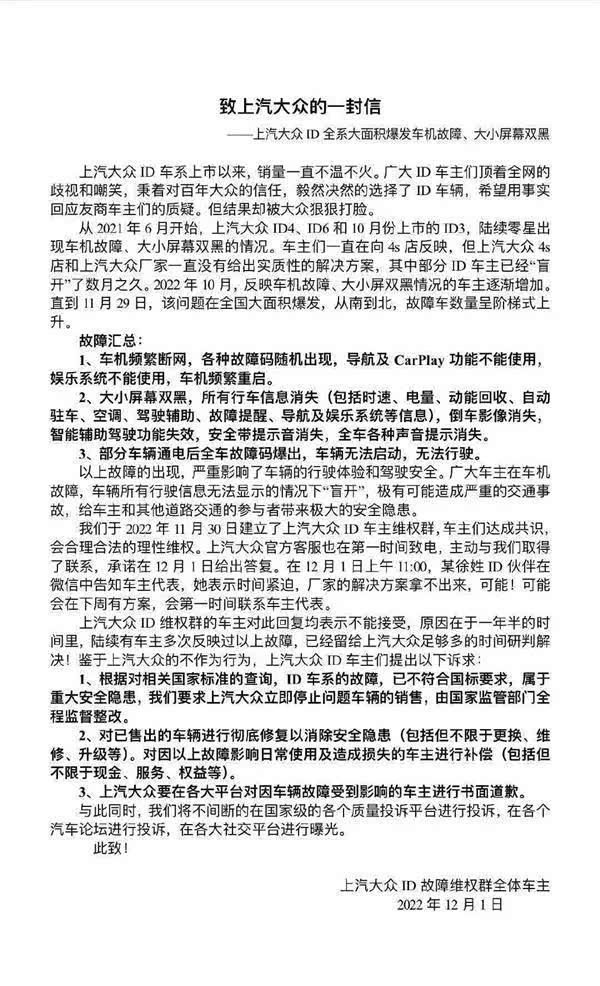 12月1日,上汽大众ID系列故障维权车主们发布了一封《致上汽大众的一封信》。