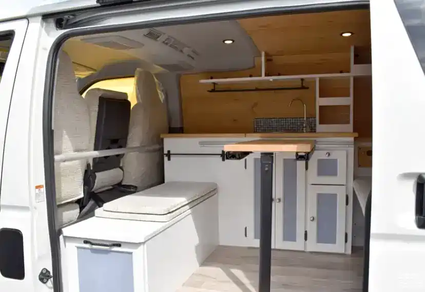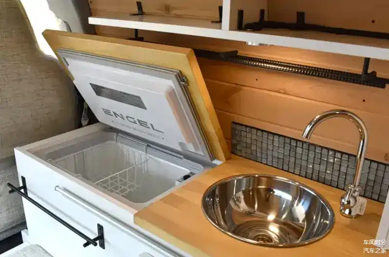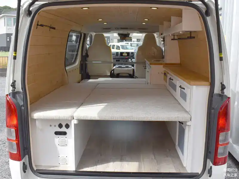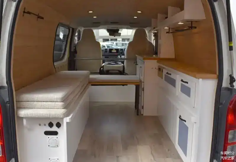 图中车辆将内部改装为了房车,咱们一起来看看它的内部构造,整体采用了日系原木风格,看上去非常的简约整洁,在车内配备了可活动的小桌子、洗手盆、水龙头、冰箱。