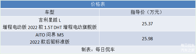 近两年,增程式电动车逐渐赢得了用户认可,这种以电机驱动为主、又可以利用发动机补充电量的新型混动,既解决了里程焦虑,又保留了电动车安静平顺的行驶感受,确实有可取之处。理想和问界就是这种技术路线的代表品牌,也都获得了不俗销量,其中 问界M5(图片 | 参数 | 询价)的月销量在七千台左右。近期,就有网友留言,说非常喜欢问界M5,但感觉这车的空间偏小,如果空间再大些就果断出手了。我们给这位网友回复的是,其实近期还有一款大尺寸的增程电动SUV上市了,而且纯电续航里程的还更长,这台车就是吉利星越L Hi·P雷神增程电动SUV,2款车型价格分别为23.97万元和25.37万元。今天,我们就拿车身价为25.37万元星越L增程电动旗舰版与车身价25.98万元的问界M5 后驱标准版做个对比,看看哪款车更适合入手。
