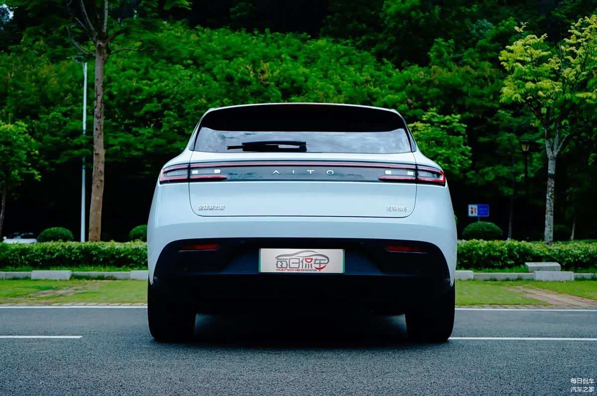 问界M5尾部造型宽大而低趴,视觉稳定感很高,也很显运动。贯穿式尾灯将“AITO”标识囊括其中,点亮辨识度不错。黑色下护板面积很大,加入五辐式扩散器造型,增添运动感。