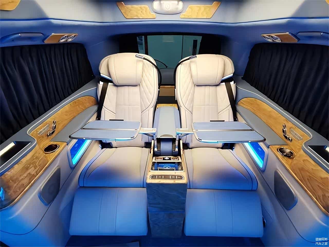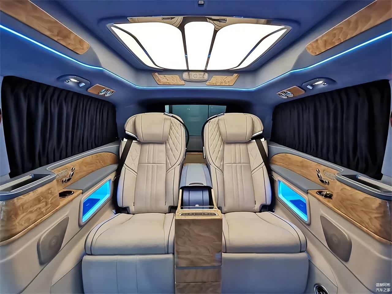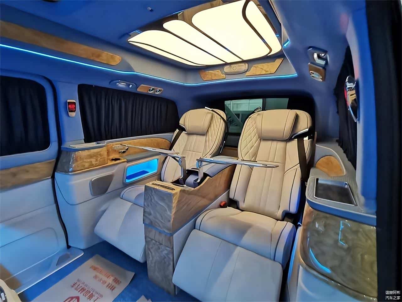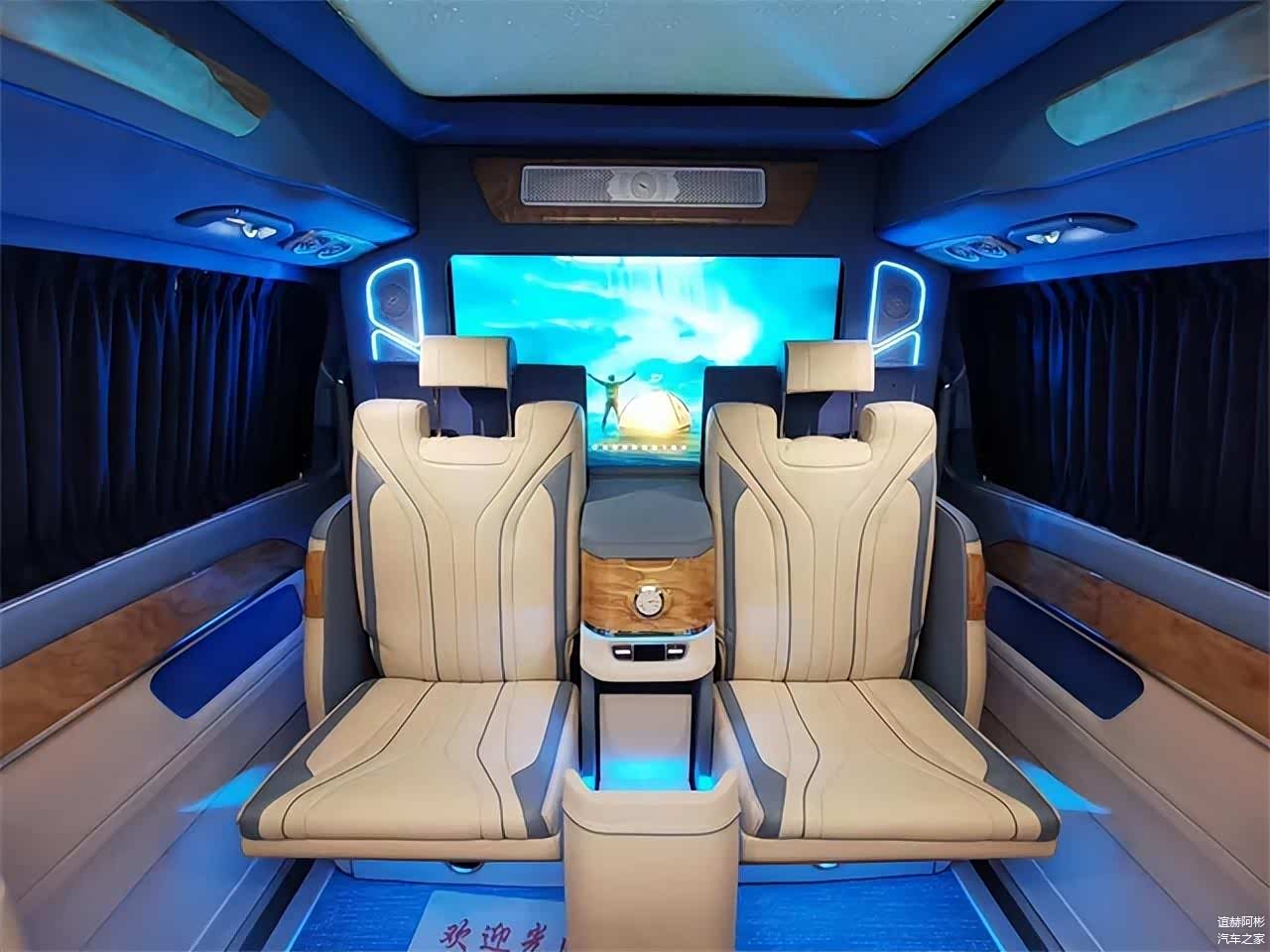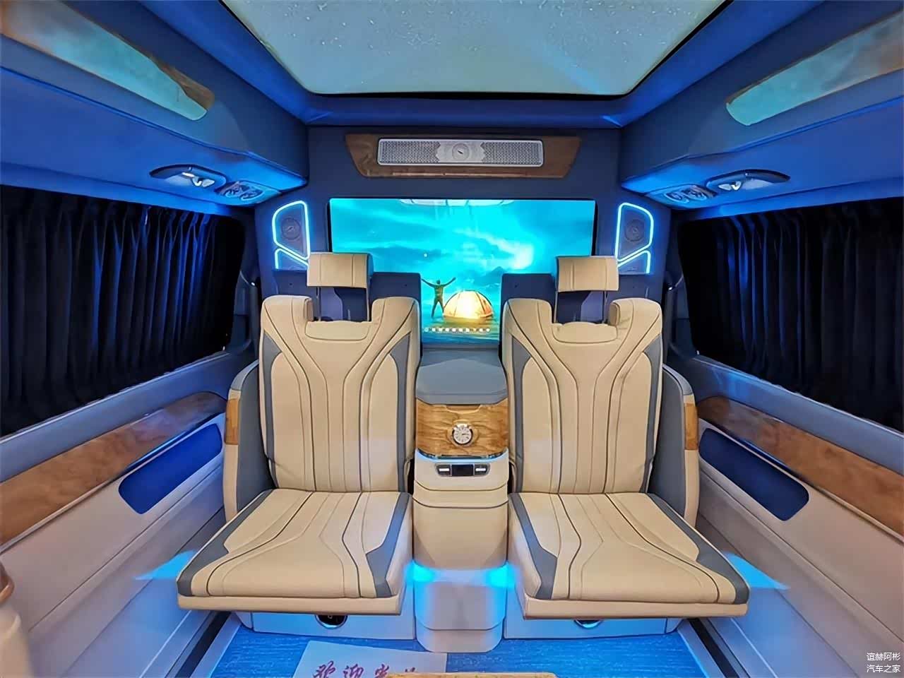 隔断吧台处设有两张隐藏座椅,可一键电动开启和收纳,平时使用非常方便,还有电动升降桌板,为商务办公提供有利条件,此外还配备了独立酒柜,更适合商务接待洽谈。同时全车搭载了立体声道环境音响,拥有18个扬声器单元的丹麦柏林之声5.1环境音响,32色的可调式氛围灯也让后舱的豪华感更加的丰富,使用隐私窗帘保障私密性,在车内也能给您打造一个专属的私人办公室。同时还可以进行私人定制,不管是奔驰改装全隔断四座、六座、七座还是通舱六座、七座车型均可。另有平顶车型在售,为您增加可选择性。车友们对这款车型是否满意呢,欢迎留言私信!
