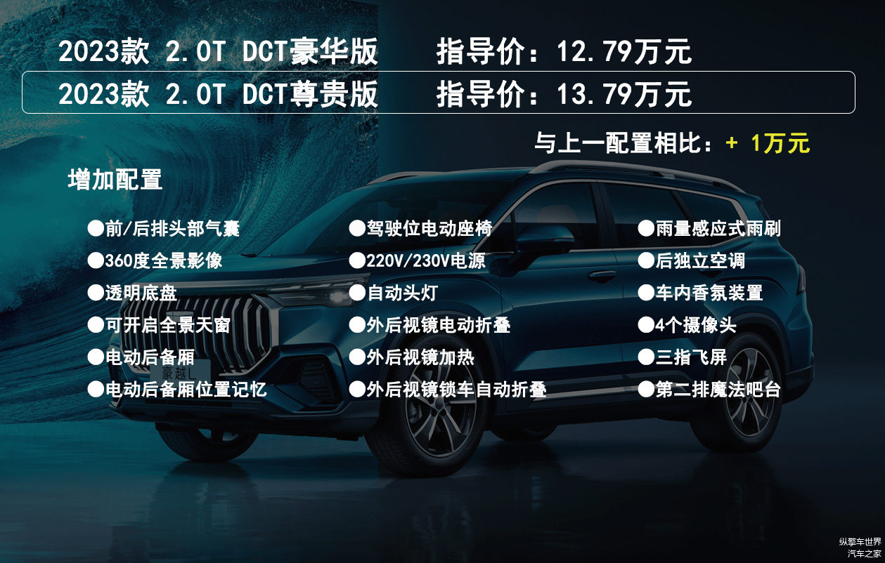 2.0T DCT尊贵版比2.0T DCT豪华版多了前/后排头部气囊、电动后备厢、220V/230V电源、可开启全景天窗、外后视镜电动折叠、雨量感应式雨刷、后排独立空调等功能,整体提升比较一般,不过价格提升也不多,值得考虑。