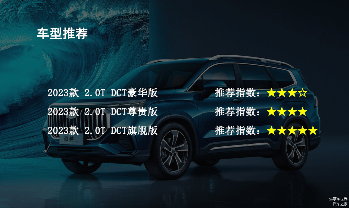 车型推荐:作为一款中型SUV,吉利豪越L在外观设计上具有不少鲜明的特色,在内饰设计上也能看出厂家的用心,三款车型中,顶配车型配置丰富,个人认为是最值得推荐的,当然如果你对配置的需求较低,选择入门级车型也能满足大部分的用车需要。