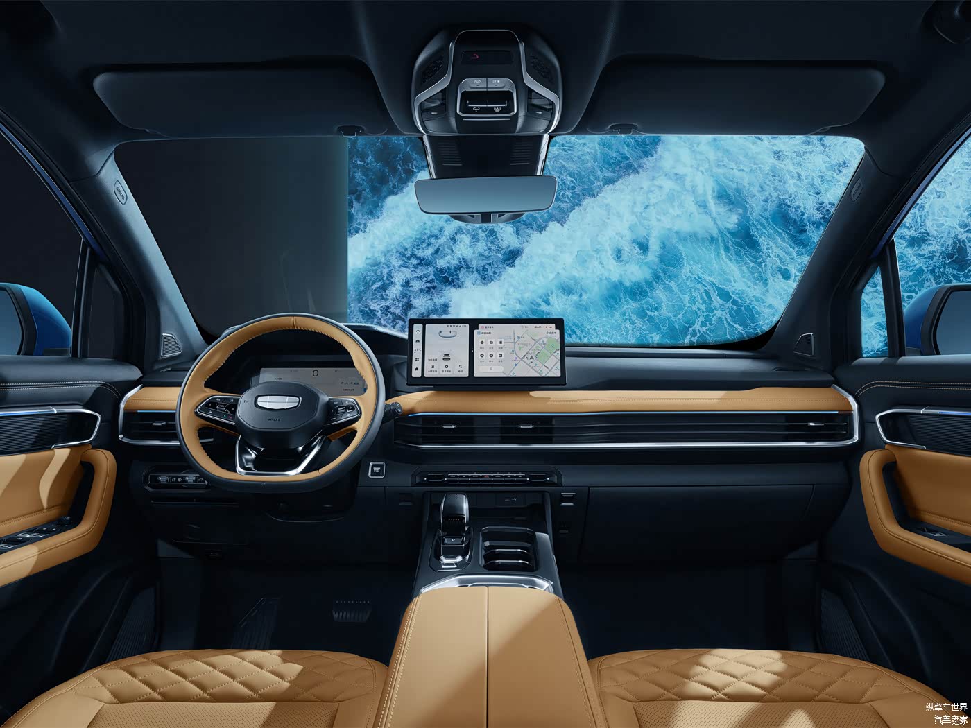 内饰方面,豪越L提供云杉绿和大漠棕两种配色可选,T字形中控台造型简约,并使用了大量的软性材质和皮质包裹,并设计了丰富的前排储物空间,实用性很强。车内配备了10.25英寸全液晶仪表和12.3英寸中控屏以及全新样式的电子档杆,进一步增强了车内的科技感和档次感。