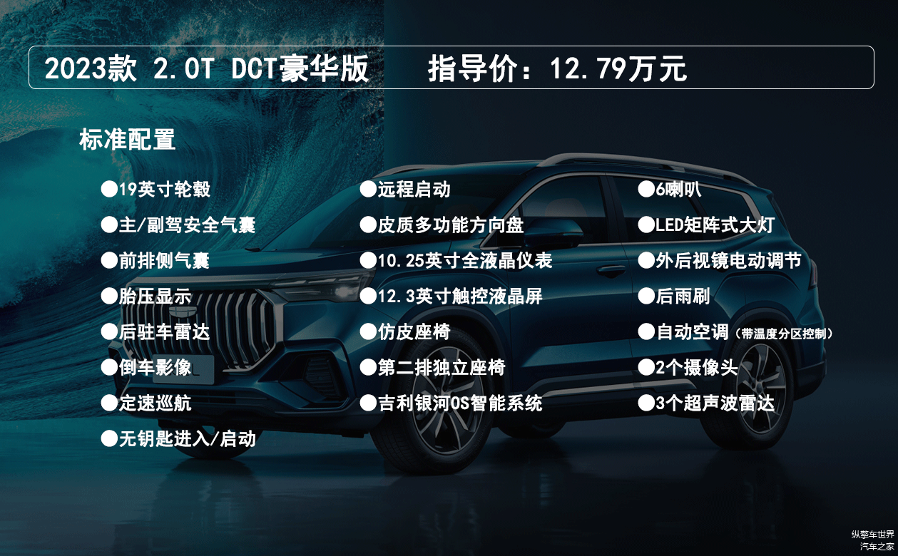 2.0T DCT豪华版车型标配了19英寸轮毂、后驻车雷达、倒车影像、定速巡航、无钥匙进入、远程启动、10.25英寸全液晶仪表、12.3英寸中控屏、第二排独立座椅、LED矩阵式大灯、自动空调等配置,配置水平不算突出,不过常用功能没有缺少,适合预算有限的消费者选择。