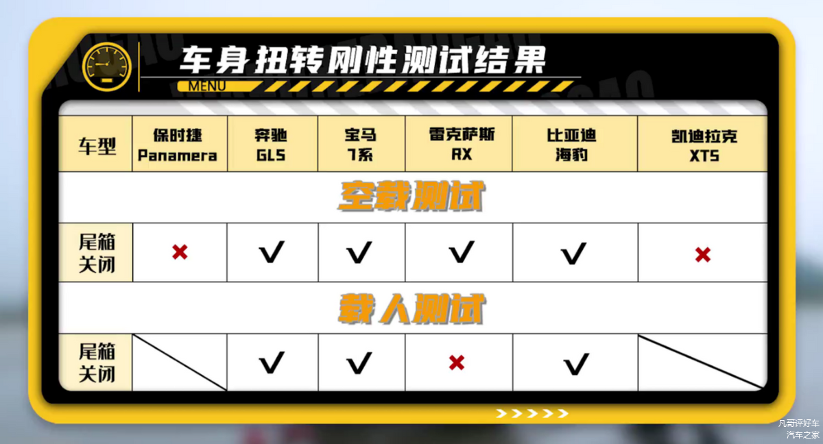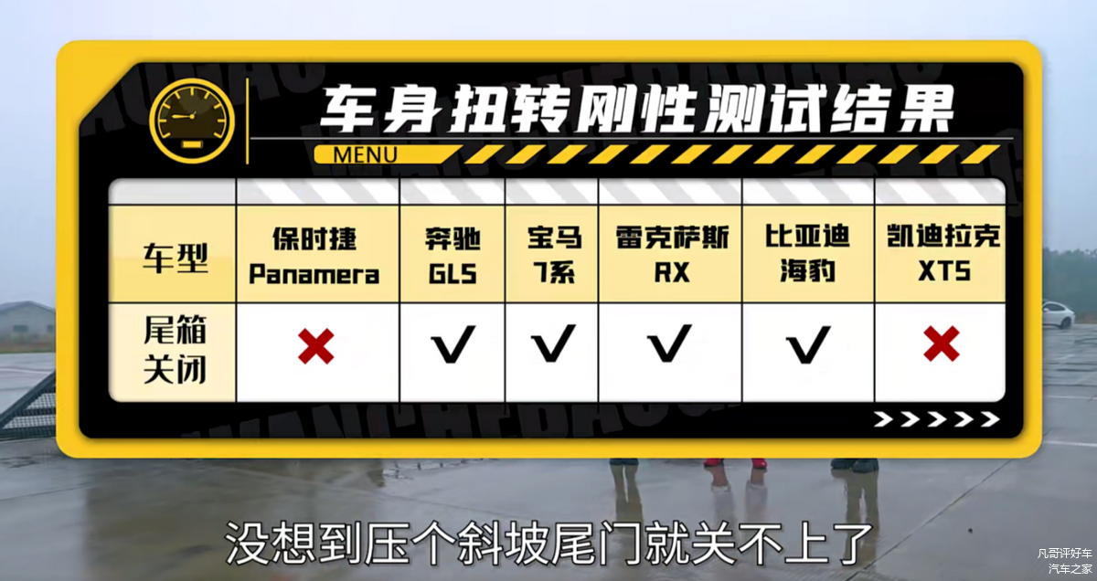 从测试结果上看,保时捷Panamera和凯迪拉克XT5的后备箱可以打开,但无法关闭,这是因为车身发生了形变或者有错位,其实本质上来说就是车身扭转刚性不够强,就好比上面说到的钢制小汤勺。