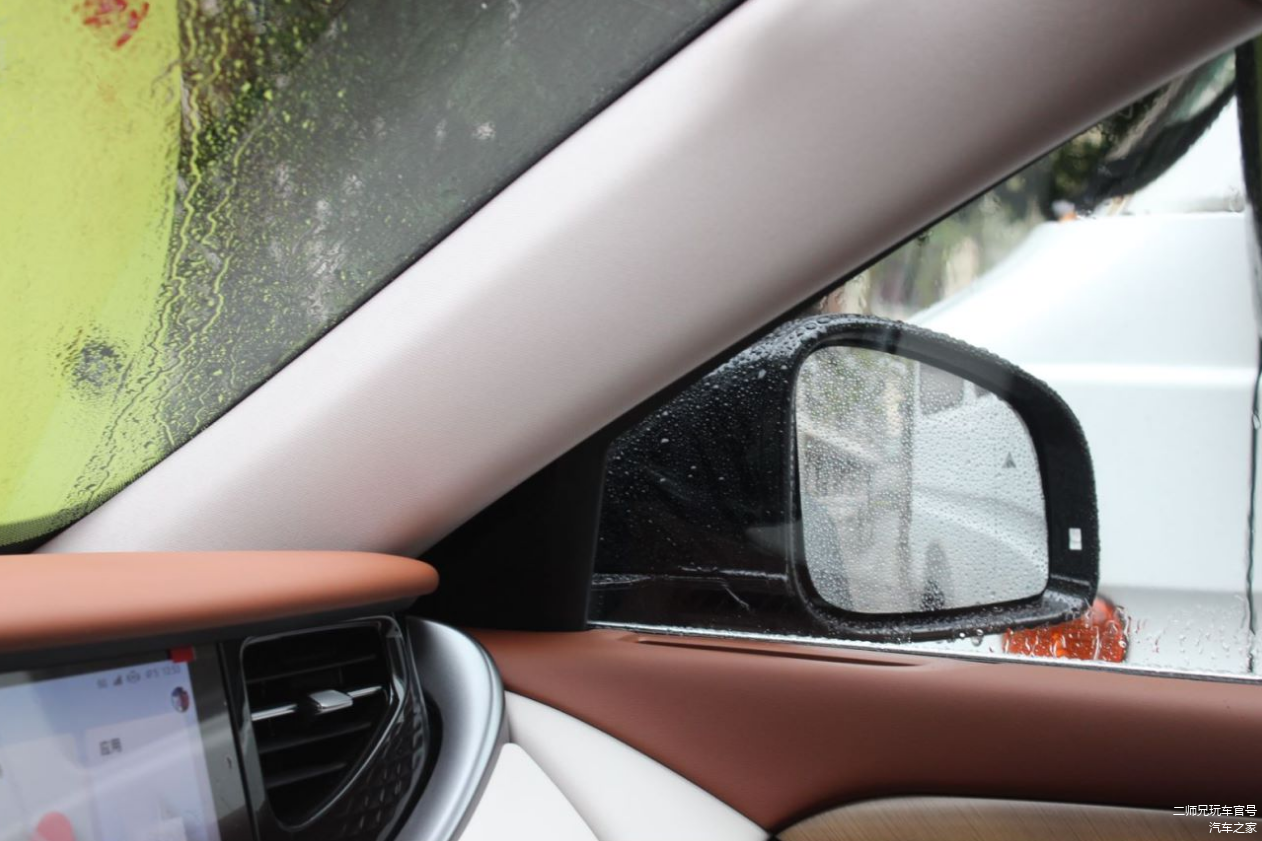 只不过在这里,要说一个缺点,那就是这辆车的后视镜三角区域很“壮硕”,对视线的遮挡也比较大,在屏幕降低之后虽然前方视野不错,但两侧的位置,就有点考验驾驶者的空间判断能力了,尤其是从主驾人员眼点的位置去看副驾的外后视镜的时候,影响会更加直接一些,这一点,希望后期可以得到优化。