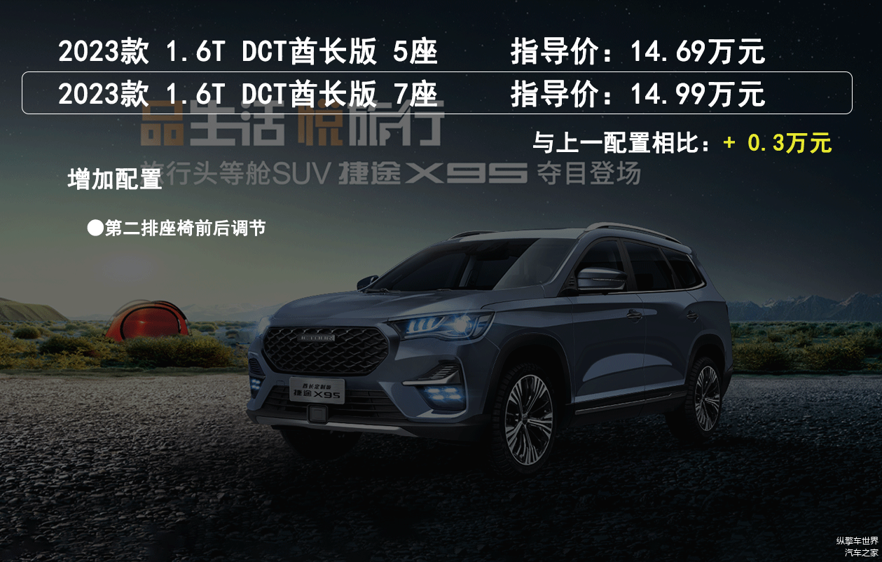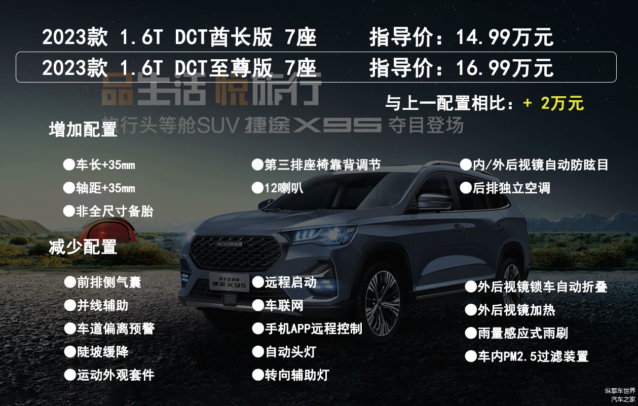 日前,我们从捷途官方获悉,捷途X95新推出了两款新车型,售价区间为14.69-16.99万元。与老款车型相比,新车主要对酋长版的配置进行了优化升级,价格保持不变,性价比进一步提升。那么对于消费者来说,在售车型中哪款配置车型更值得选呢?今天我们就来详细分析一下。