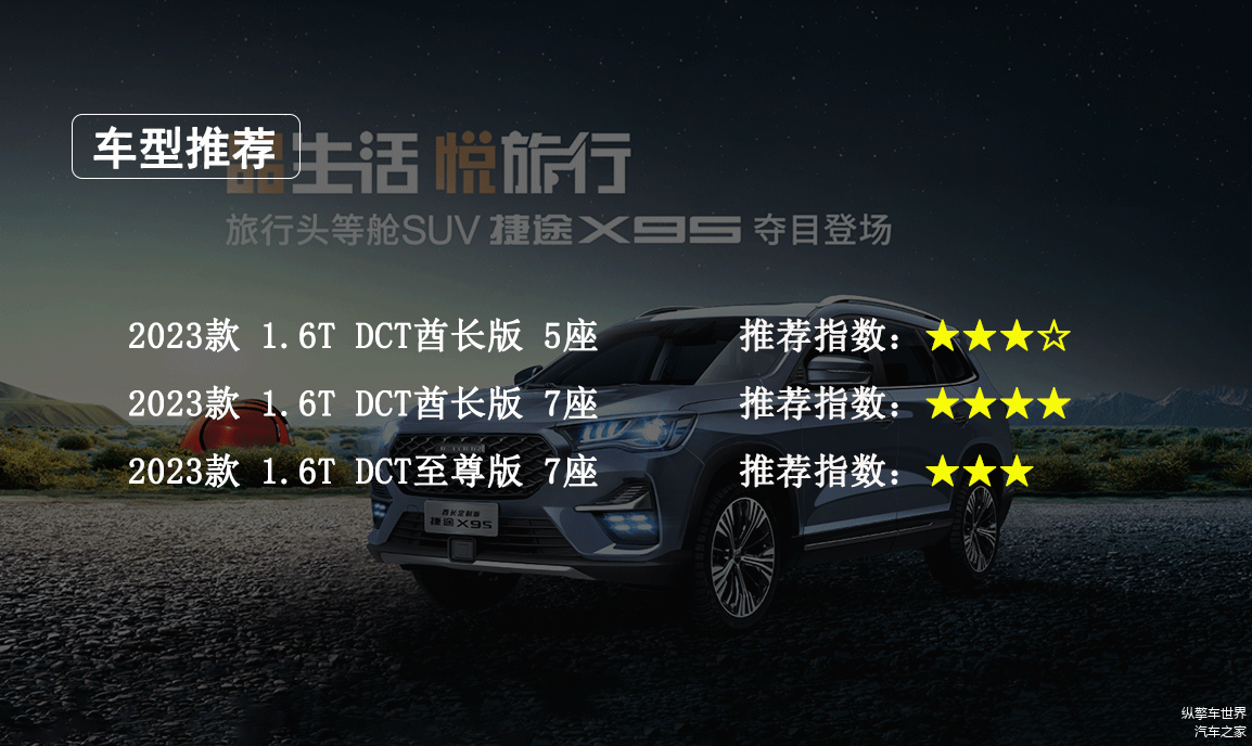 严格来说,2023款捷途X95只有两款配置车型,那就是酋长版和至尊版,而至尊版的配置水平明显不如酋长版,普通消费者选择酋长版即可,至于选5座还是7座,根据自己的需要进行选择即可。