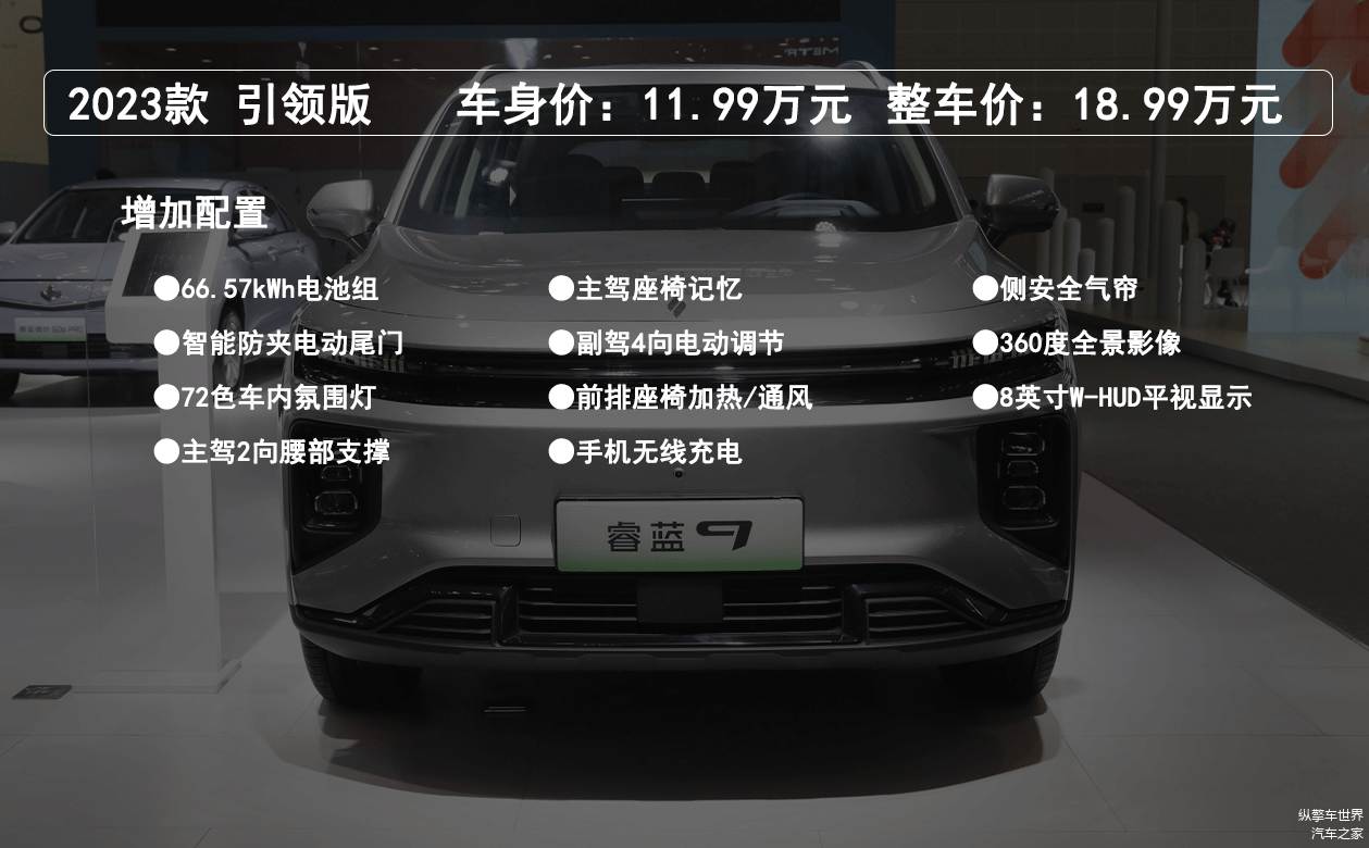 引领版车型车身价11.99万元,整车价18.99万元,车身价贵了1万,但整车价却高了2万,这个版本车型搭载了66.57kWh的电池组,CLTC续航里程为470km,配置方面增加了电动尾门、72色车内氛围灯、主驾腰部支撑、前排座椅加热/通风、手机无线充电、360度全景影像、侧安全气帘、W-HUD平视显示等功能,这个版本续航里程还算能接受,价格提高的也不算太多,相对来说性价比比较高。