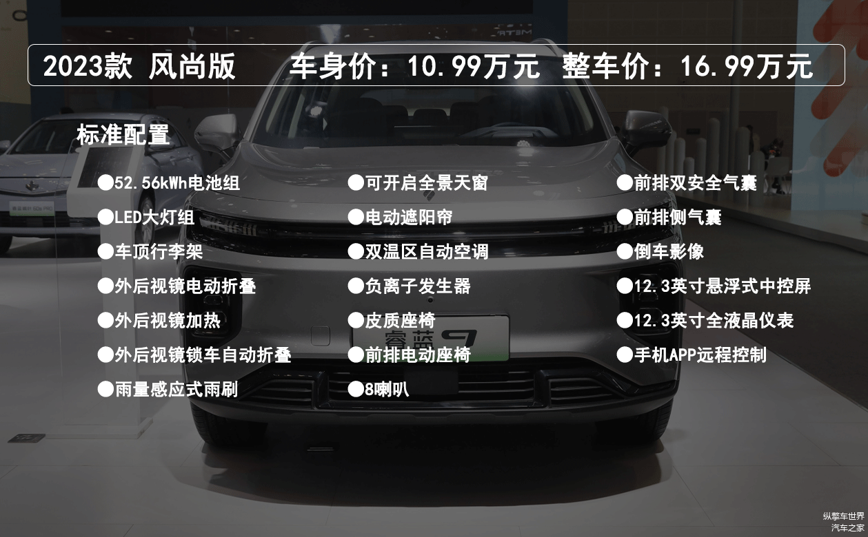 入门级的风尚版车型车身价为10.99万元,含电池的整车价为16.99万元,该版本搭载了52.56kWh的电池组,CLTC续航里程为380km,配备了LED大灯组、外后视镜电动折叠/锁车自动折叠、雨量感应式雨刷、可开启全景天窗、电动遮阳帘、皮质座椅、前排电动座椅、8喇叭、倒车影像、12.3英寸中控屏及液晶仪表,整体配置水平不算太出彩,而且续航里程不高,性价比一般。