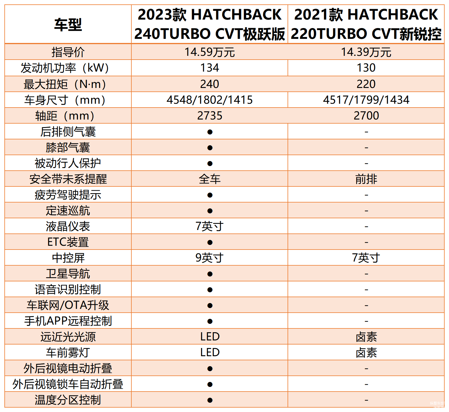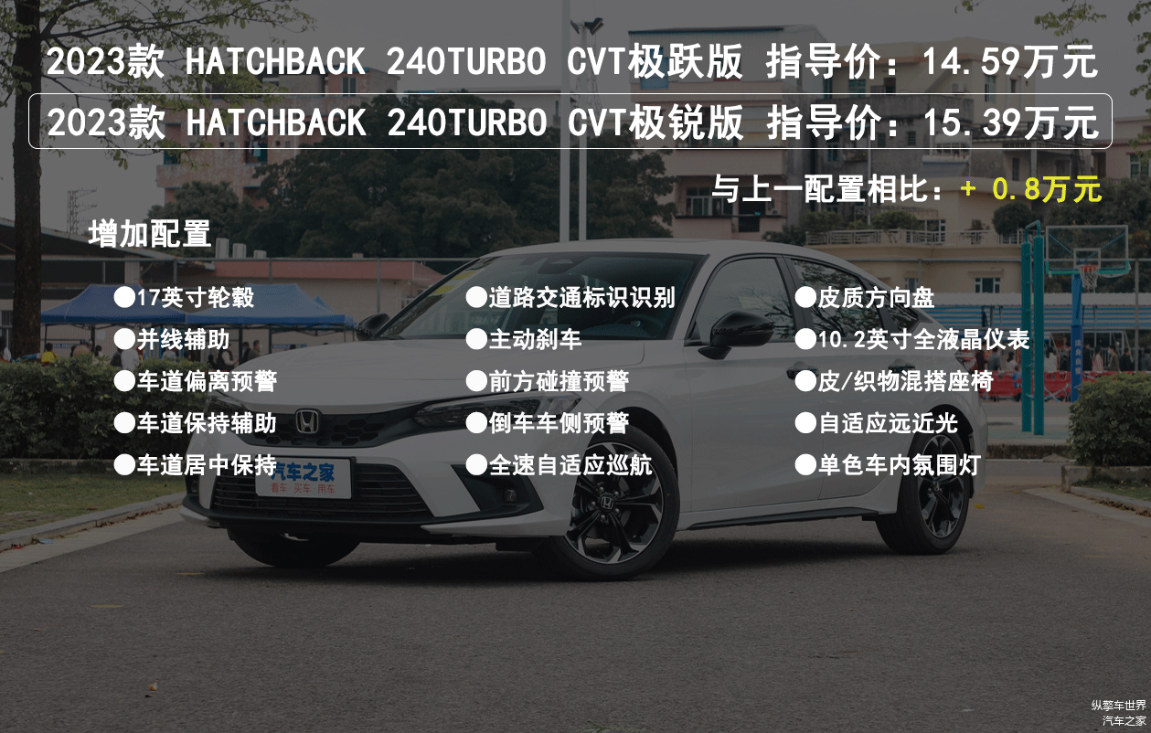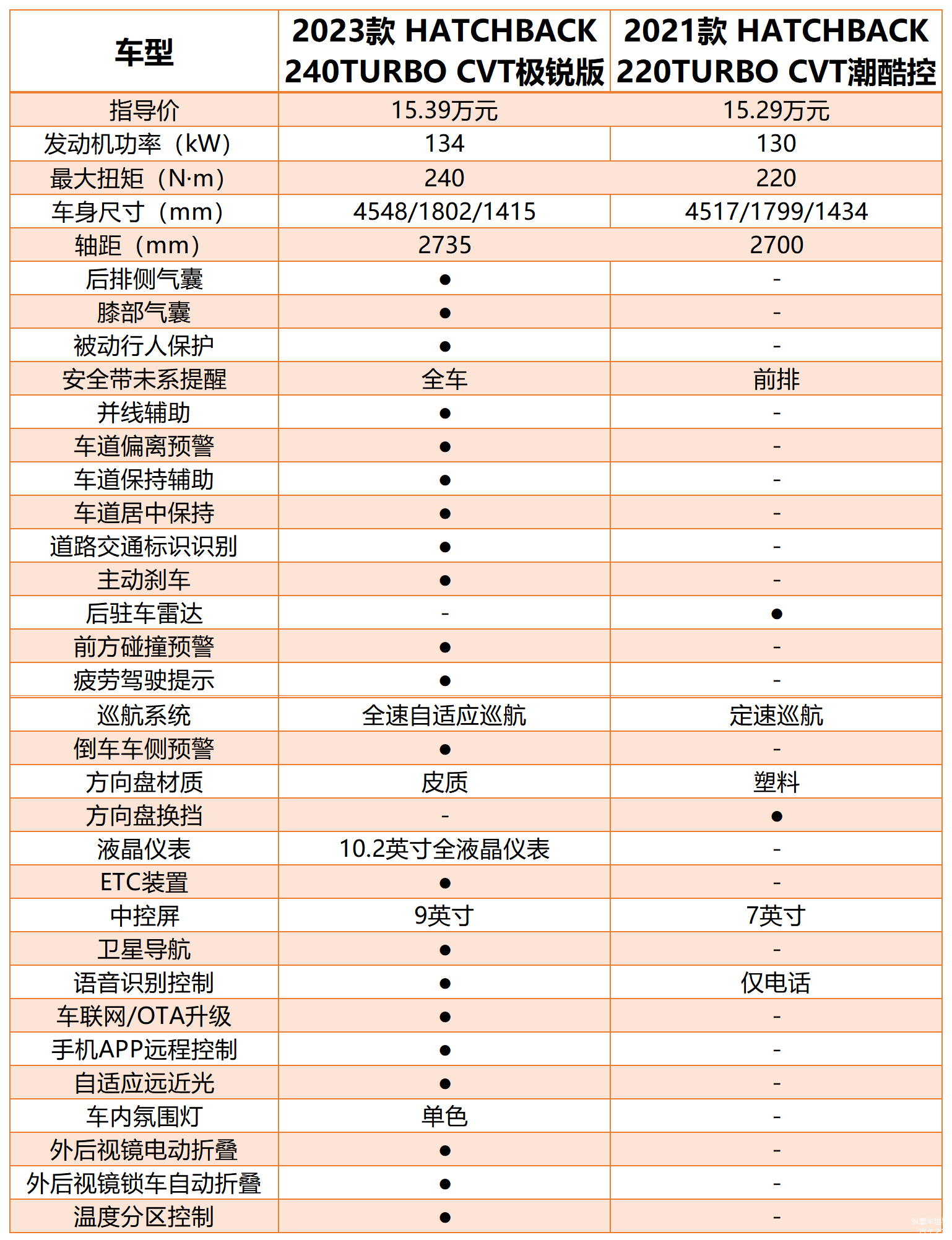 2023款极锐版对应2021款潮酷控,价格贵1000元,除了动力和安全气囊等变化外,还增加了包括并线辅助、车道保持、主动刹车、疲劳驾驶提示、全速自适应巡航等配置。