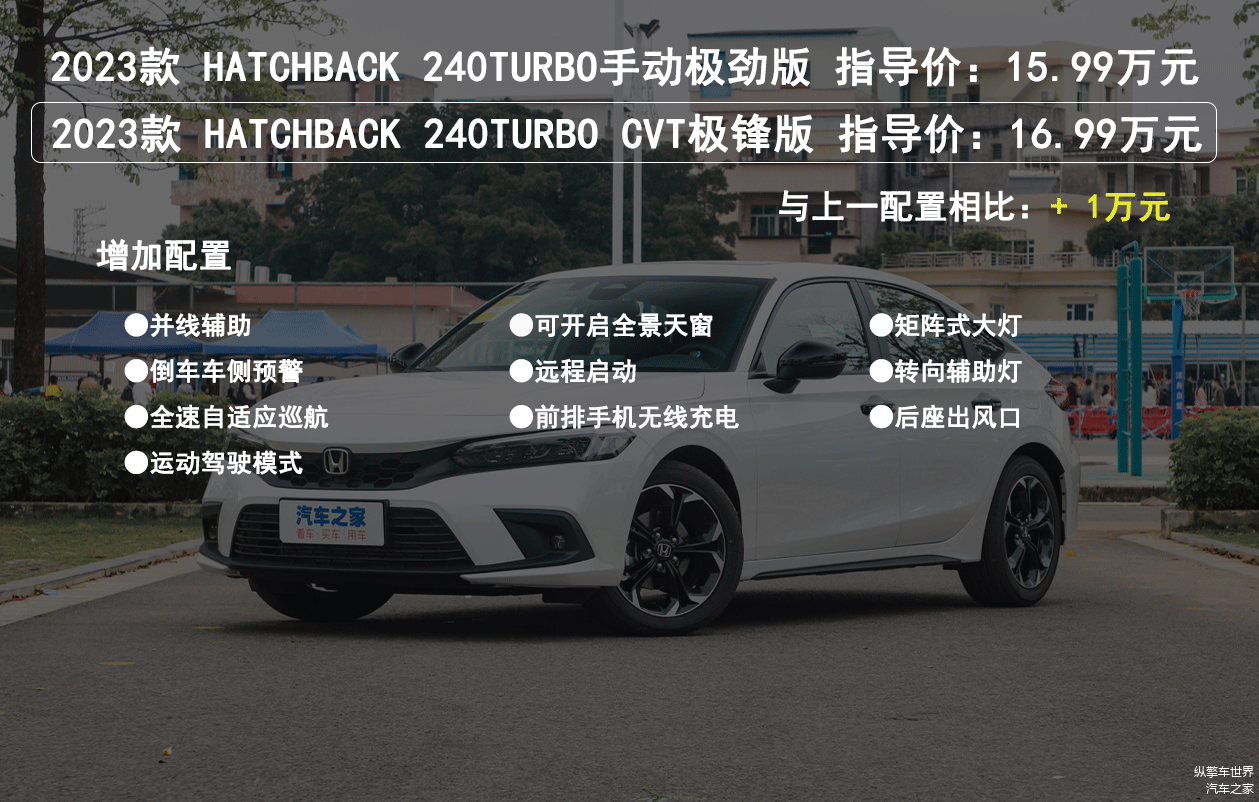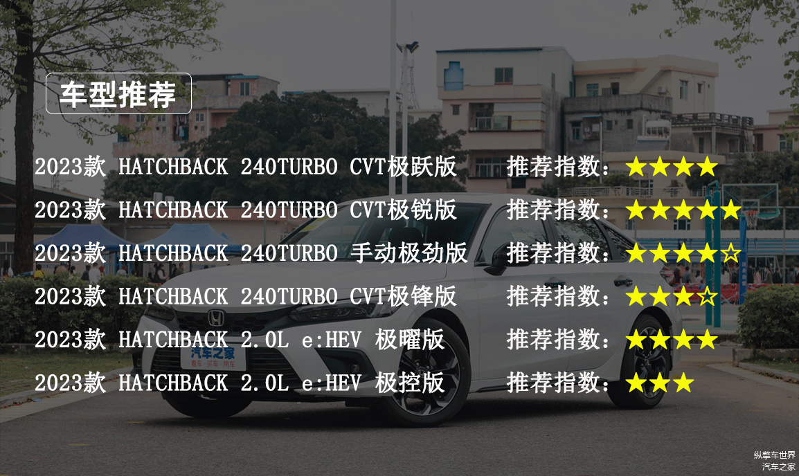 车型推荐:第十一代思域HATCHBACK在配置上进行了较大的提升,新增的混动车型也给消费者带来了更多的选择,对于消费者而言是个不错的消息。4款燃油车型中,如果你追求性价比,个人最推荐极锐版,配置比较丰富,价格也相对合理,综合性价比最高,不过如果你是一个追求运动和驾控感的消费者,相信还是手动挡版本更能满足你的需要。至于两款混动版车型,个人认为极曜版就已经足够了,极控版虽然配置更丰富一些,但价格也相对较高,从个人角度来说推荐度一般。
