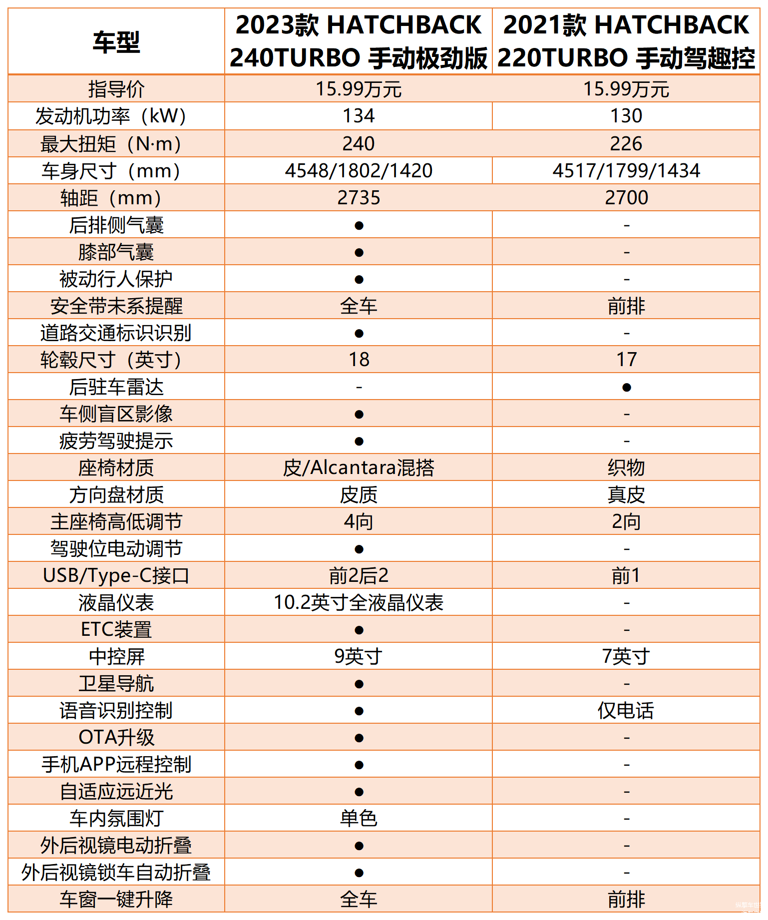 2023款手动极劲版对应2021款手动驾趣控版本,售价都是15.99万元,但配置上新款增加了后排侧气囊、膝部气囊、车侧盲区影像、疲劳驾驶提示、皮/Alcantara混搭座椅、驾驶位电动座椅等功能。