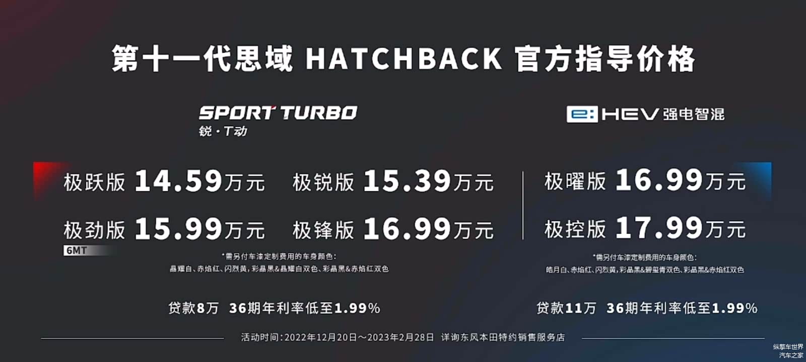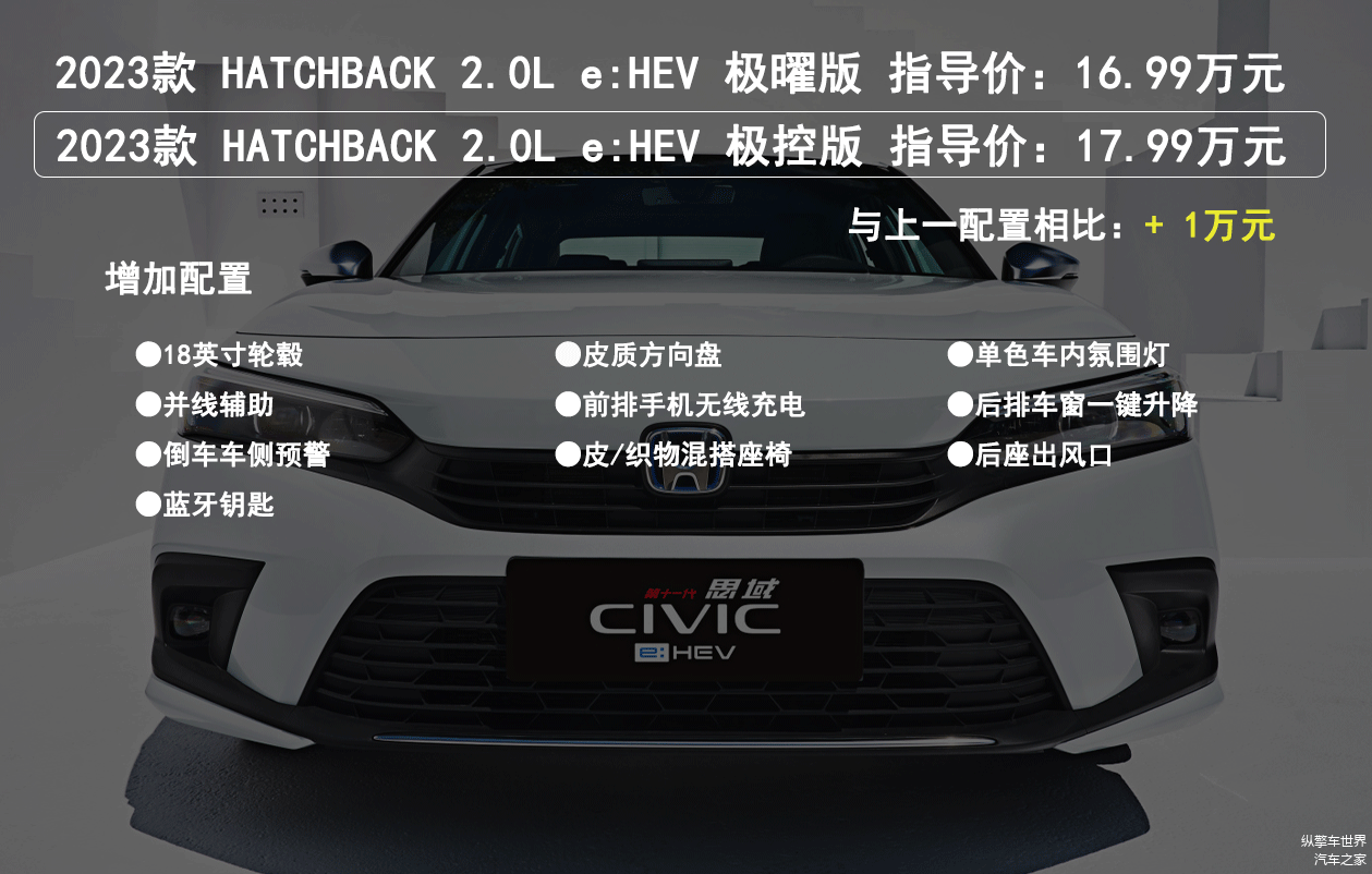 12月20日,本田思域HATCHBACK正式上市了,新车推出了4款燃油车型和2款混动版车型,其中前者的售价区间为14.59-16.99万元,后者售价区间为16.99-17.99万元。思域HATCHBACK采用了溜背式设计,造型较三厢版车型更加运动,混动版车型更是兼顾了性能体验和燃油经济性,为消费者提供了更加丰富的选择。那么燃油版和混动版哪个配置版本性价比更高呢?下面我们就来详细分析一下。