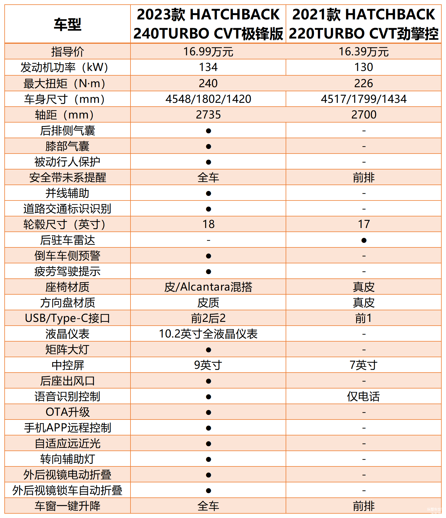 2023款极锋版对应2021款劲擎控版本,售价高了6000元,配置上增加了后排侧气囊、膝部气囊、倒车车侧预警、并线辅助、道路交通标识识别、疲劳驾驶提示、矩阵大灯、后座出风口、外后视镜电动折叠/锁车自动折叠等功能。