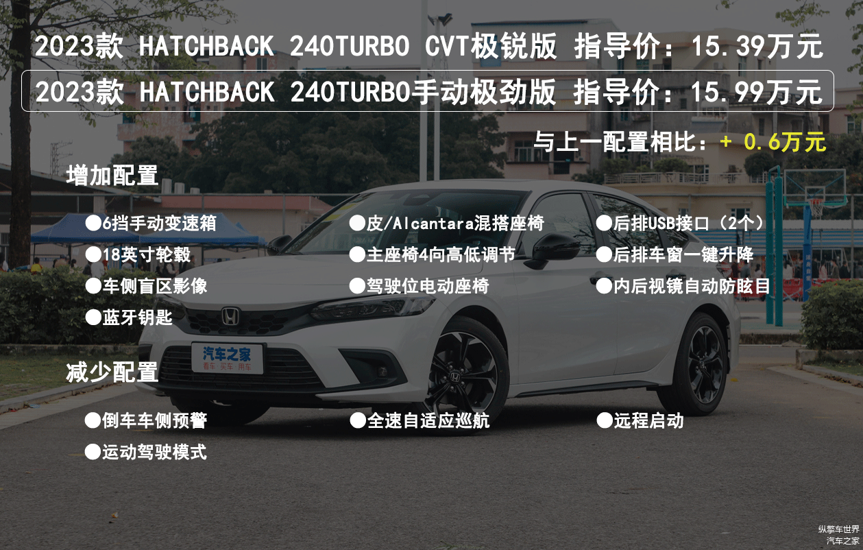 手动极劲版比极锐版贵6000元,除了配置上有一定的提升,作为唯一的手动挡版本,相信也是不少喜爱思域HATCHBACK的朋友选择这款车的重要理由,而且这个版本的价格也不算很高,6000块的差价个人认为还是值得的。