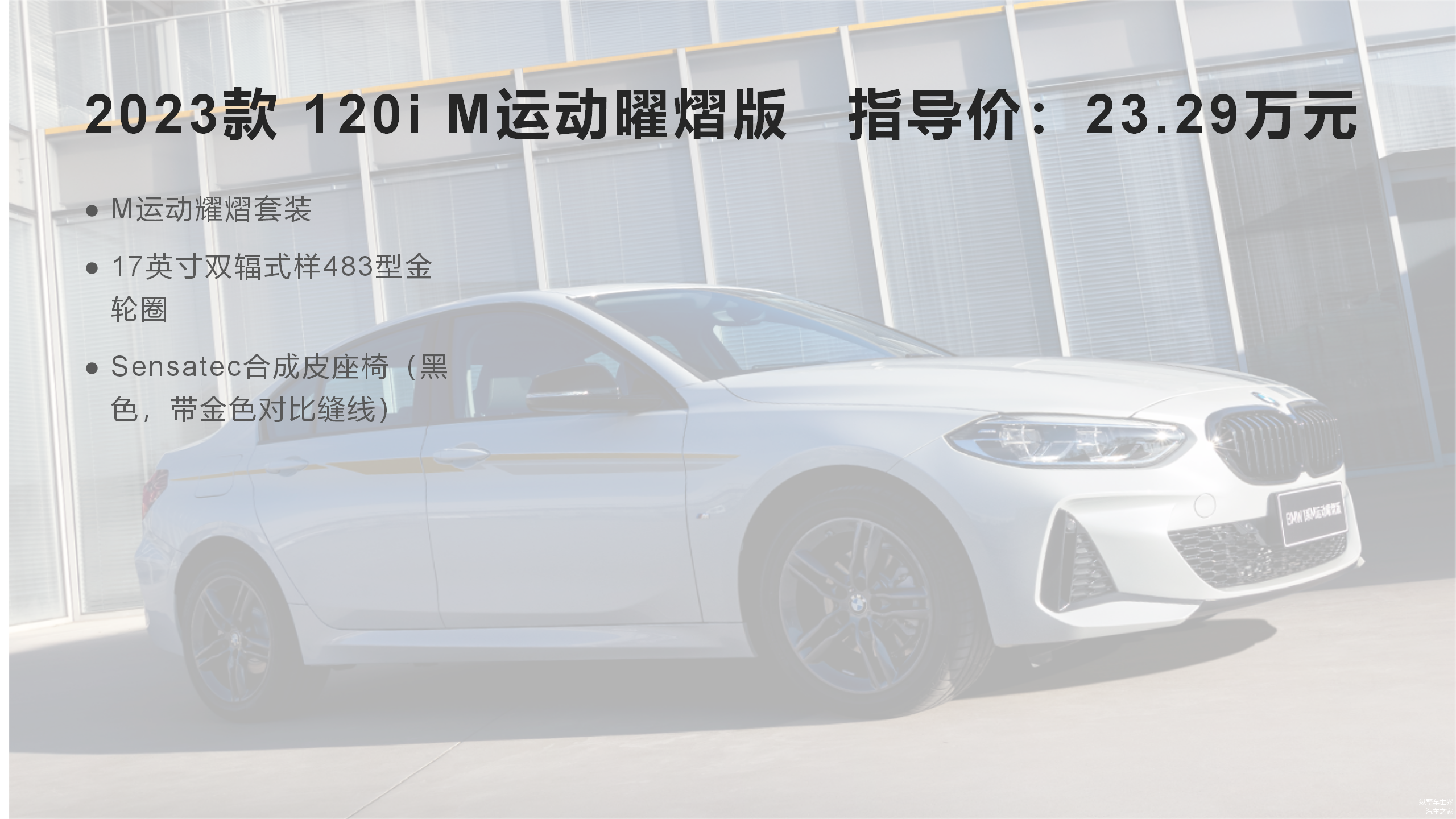 作为新增车型,120i M运动曜熠版在外观上使用了M运动耀熠套装,增加了金银双色饰条、带金色对比缝线的座椅等,更加富有个性,获得这些的代价只有3000元,对于追求个性的年轻消费者来说值得考虑。