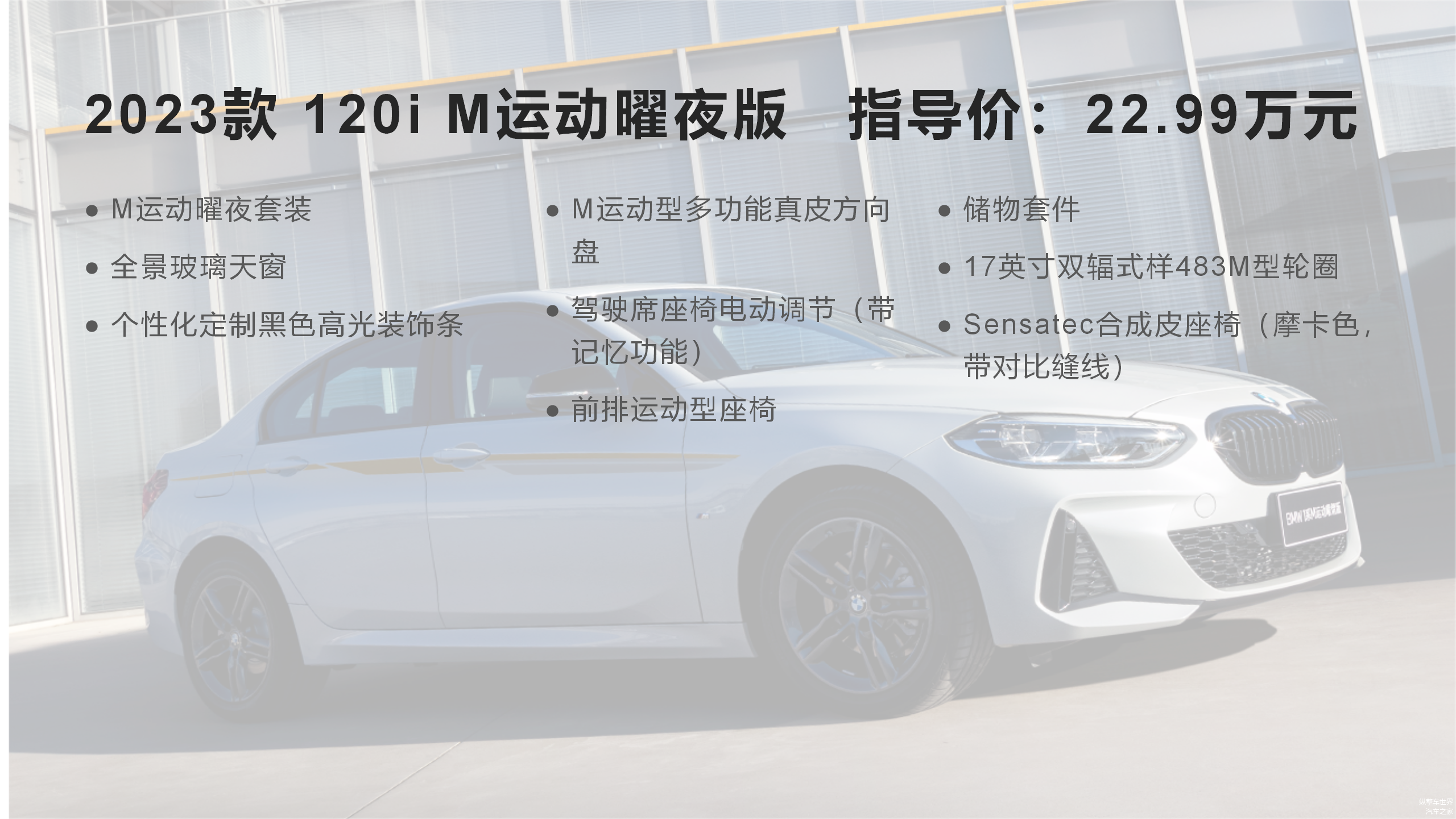 120i M运动曜夜版增加了M运动曜夜套装、M运动型多功能真皮方向盘、驾驶席座椅电动调节(带记忆功能)、带对比缝线的合成皮座椅等,更多的是突出了车辆的运动感,对于外观控来说还是很有吸引力的,不过运动曜夜版比普通的运动版贵了2万多,是否值得买还要结合预算来考虑。