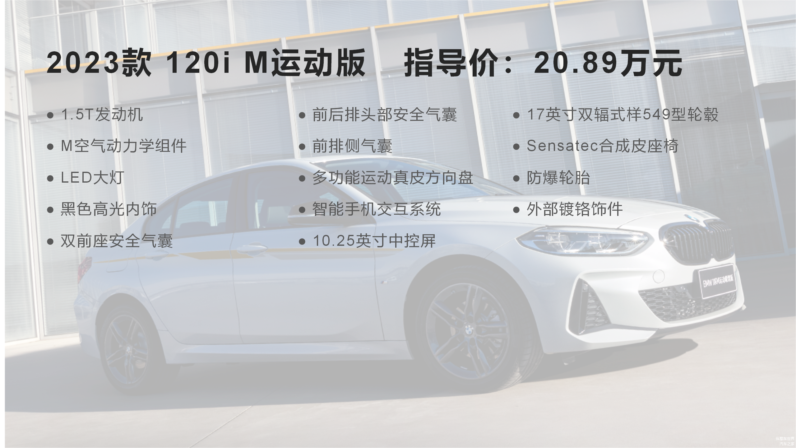 2023款 120i M运动版标配了后驻车雷达、倒车影像、运动外观套件、真皮方向盘、10.25英寸中控屏、LED大灯组、外后视镜电动调节、雨量感应式雨刷、手动空调等,看惯了自主品牌的丰富配置,再看宝马1系的配置真的感觉很简陋,不过买这款车消费者对于配置恐怕并不看重,最关键的是这是一台宝马。
