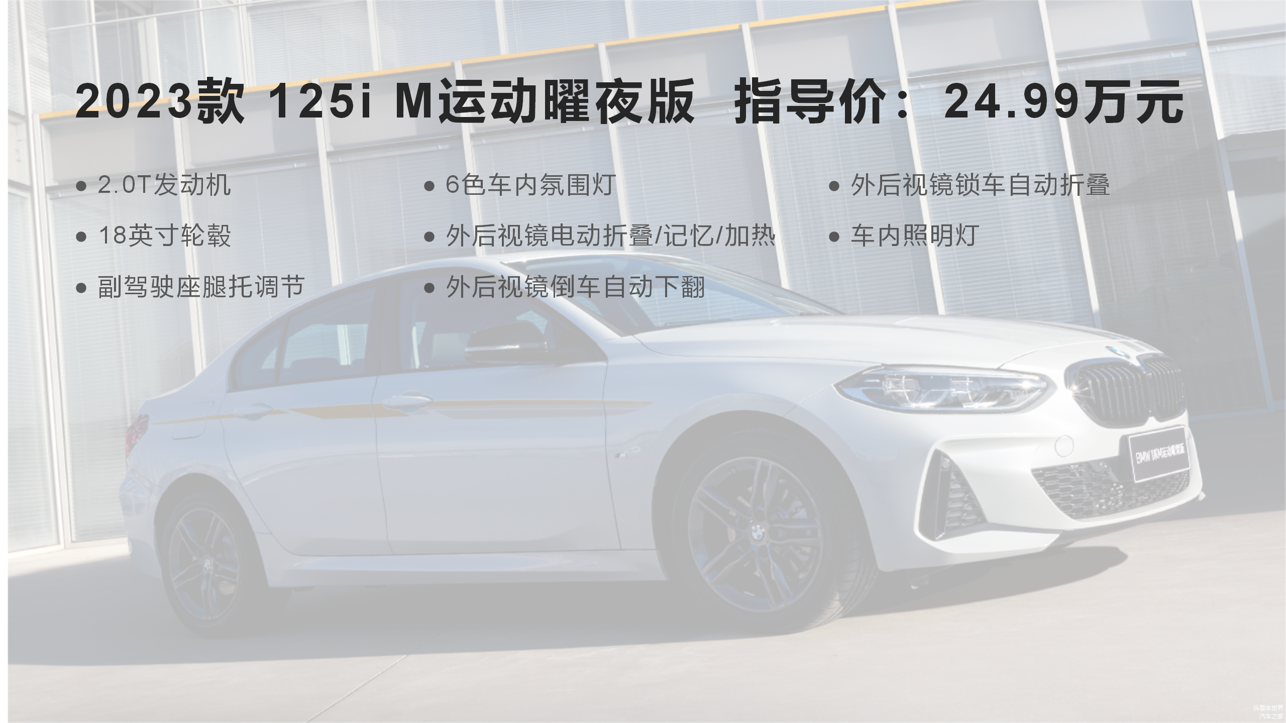 125i M运动曜夜版配备了2.0T发动机以及18英寸轮毂,此外还增加了6色车内氛围灯、外后视镜电动折叠/记忆/加热、外后视镜倒车自动下翻、副驾驶座腿托调节,价格比耀熠版贵1.7万元,对于不满足1.5T发动机的消费者来说还是值得考虑的。