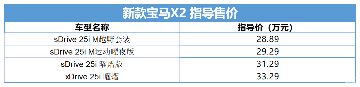 日前,我们从宝马官网获悉,新款宝马X2正式上市,新车共包含4款车型,售价区间为28.89-33.29万元。与老款车型相比,新车宝马X2对原有车型进行了精简,价格进行了小幅上调,并且新增了两款耀熠版车型,新增车型售价分别为31.29万元和33.29万元,属于次顶配版本和顶配版本。此外,新车还搭载了全新发动机,在动力和油耗方面有一定的变化。那么对于消费者来说,新款宝马X2哪个配置更值得买呢?下面我们就来分析一下。