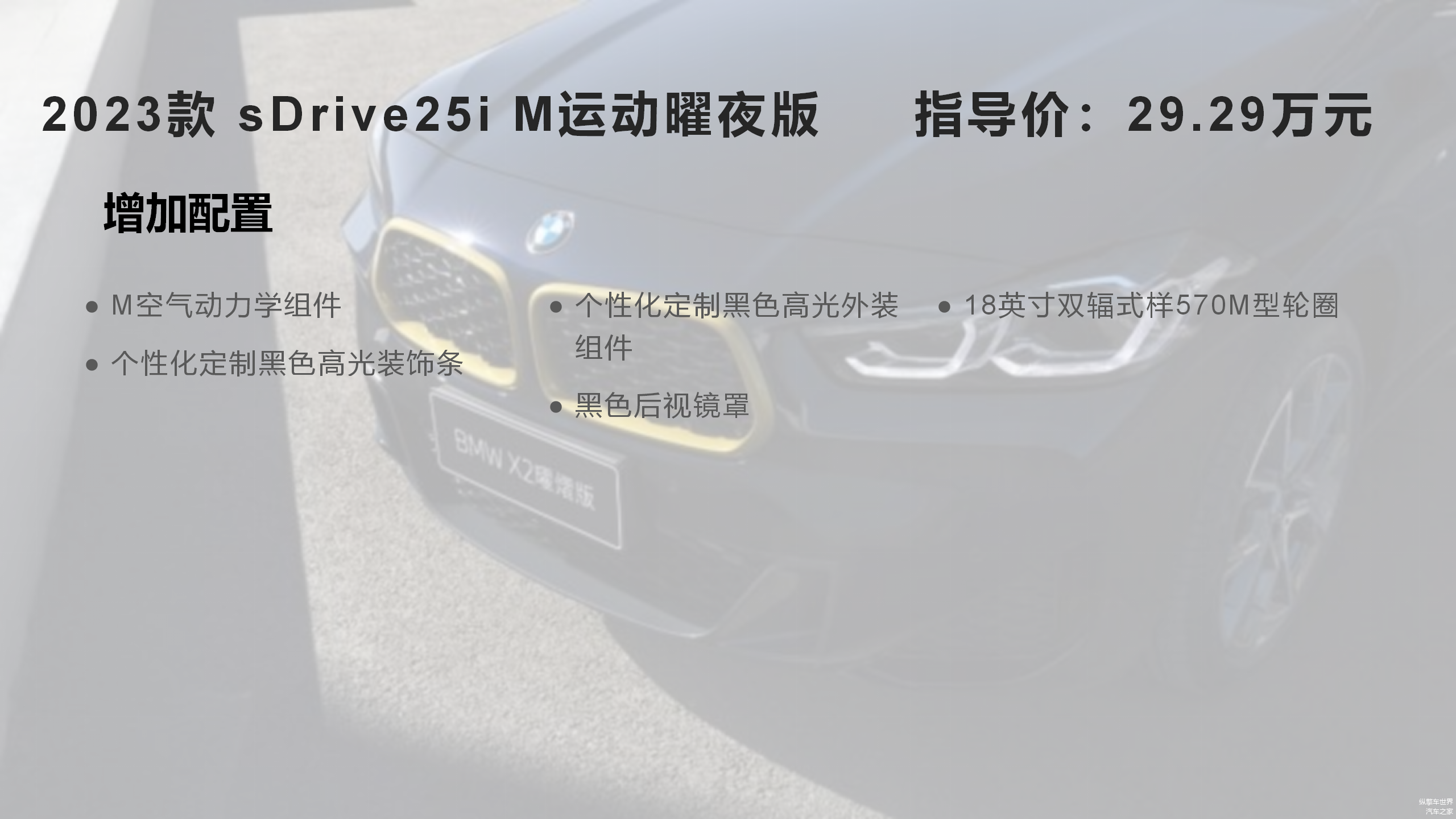 sDrive25i M运动曜夜版的主要不同在于外观,例如增加了M空气动力学组件、个性化定制黑色高亮饰条、黑色后视镜罩等,价格只比上一版本贵4000元,但运动感却一下就上来了,个人认为这个版本非常值得推荐。