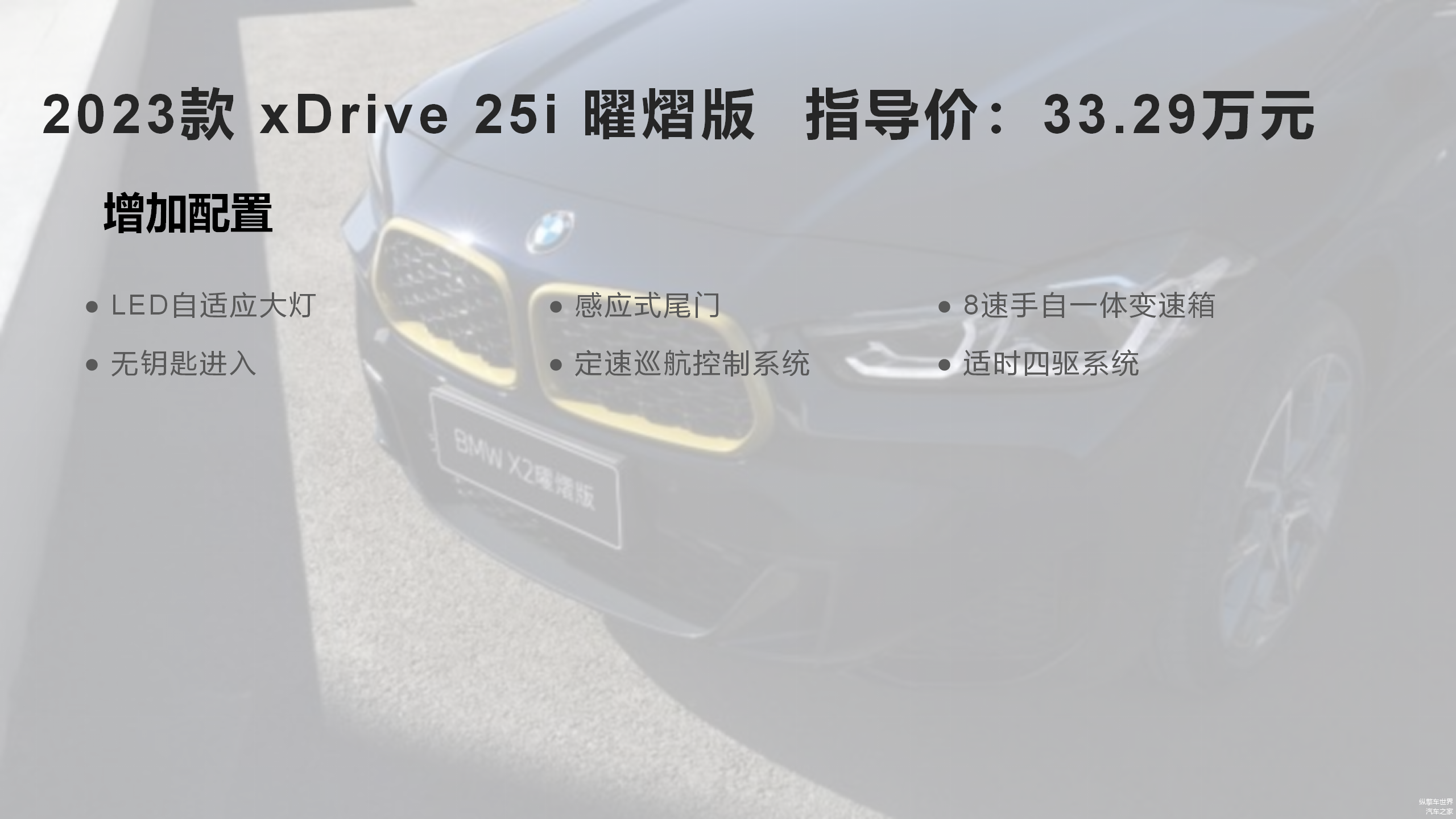 同样是新增车型,xDrive 25i 曜熠版主要增加了自适应远近光、无钥匙进入、定速巡航、适时四驱系统等,价格同样比上一版本高2万,不过除了四驱系统,其他配置并没有什么值得称道的,综合性价比一般。