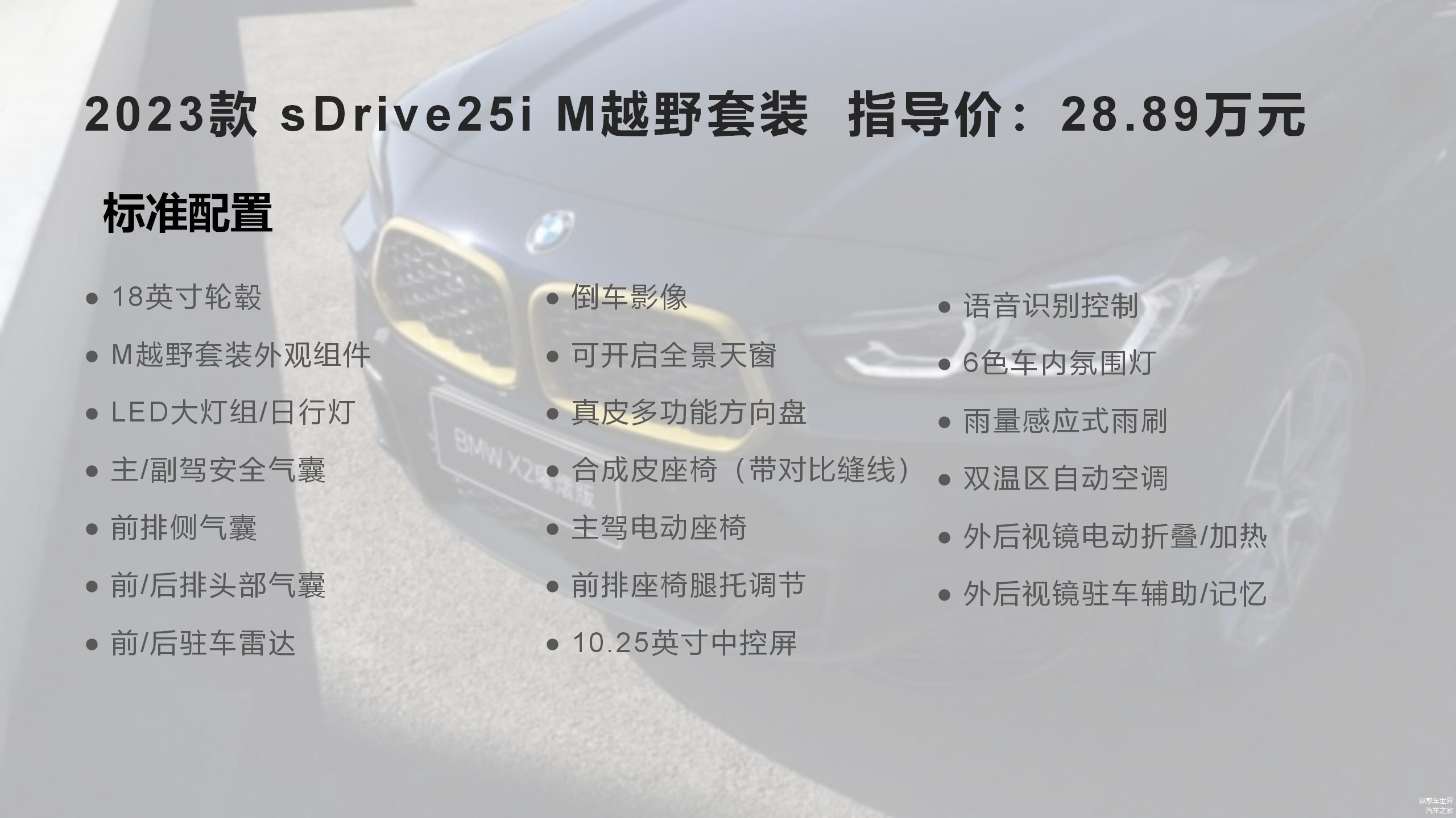 作为入门版车型,sDrive25i M越野套装标配了18英寸轮毂、前/后驻车雷达、倒车影像、运动外观套件、可开启全景天窗、真皮方向盘、10.25英寸中控屏、LED大灯组、外后视镜电动电动折叠/记忆/加热/倒车自动下翻/锁车自动折叠、双温区自动空调等,相对来说配置还是比较丰富的,再加上是4款车型中价格最低的版本,性价比还是不错的,预算有限的情况下可以考虑该版本。